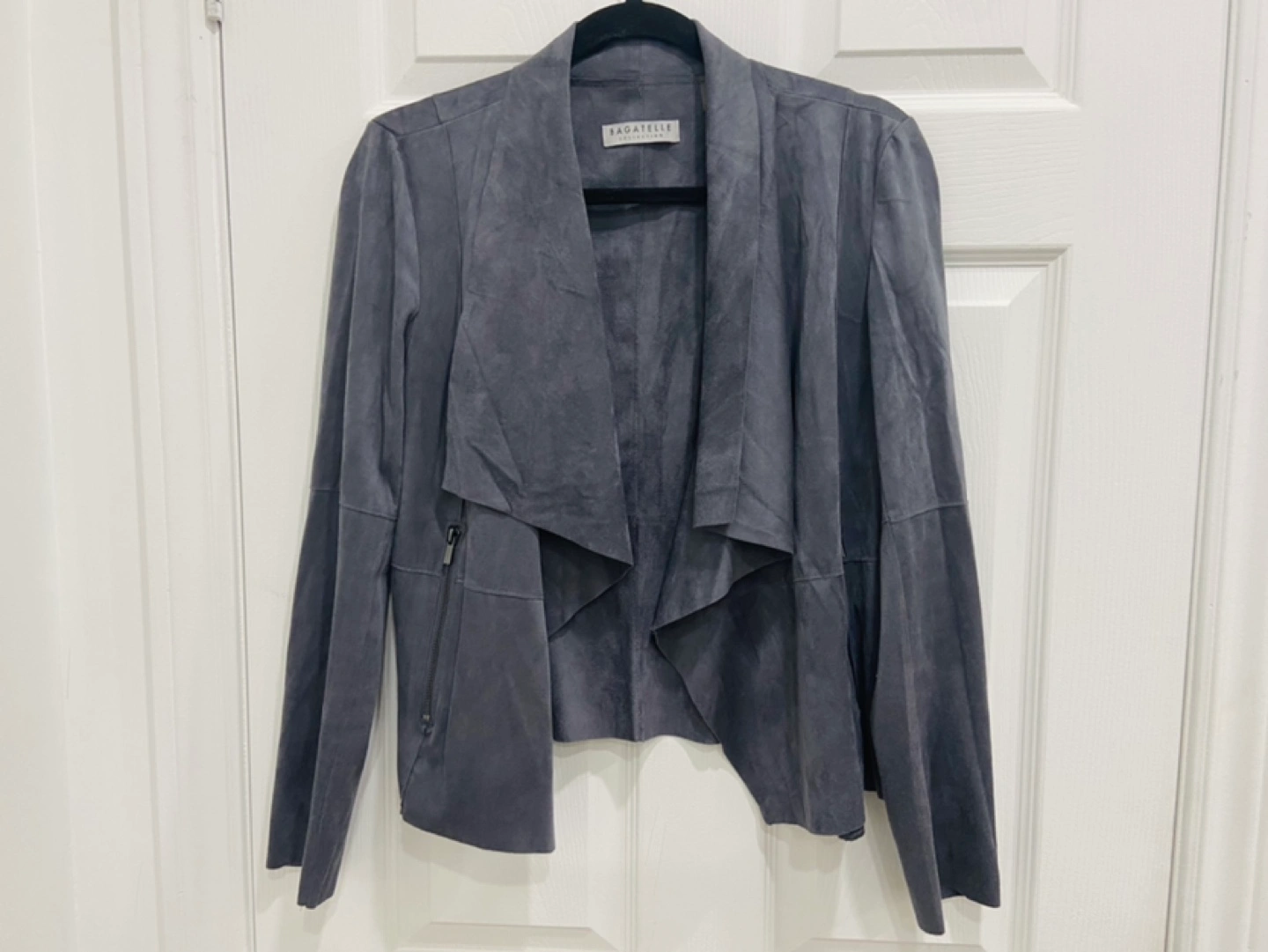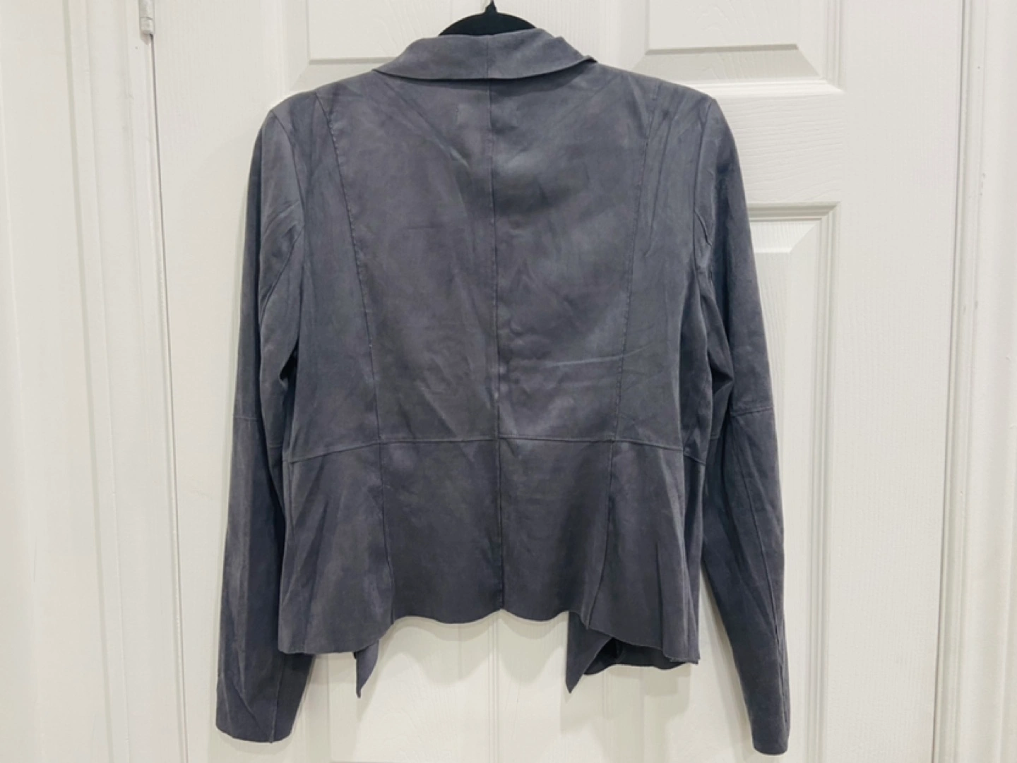 Women's Jacket Waterfall Collar Asymmetrical Hem Jacket Jacket for Women Grey suede jacket. Long sleeves. Two pockets. Zipper closure. Open front.