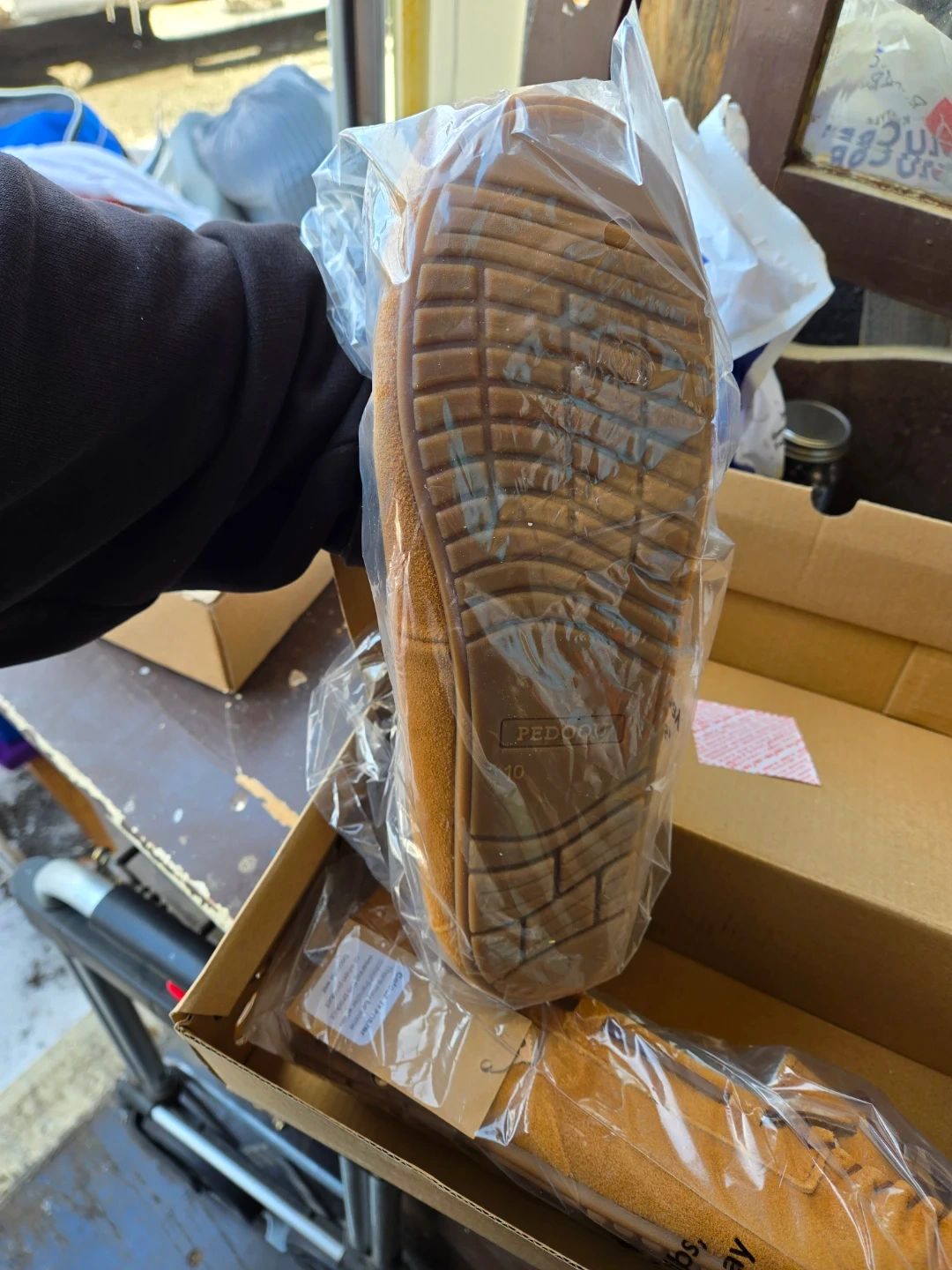 Brand new PEDOQUU indoor comfort moccasins. These are a tan suede, size 10 US, with a durable rubber sole. They're perfect for keeping your feet cozy at home!