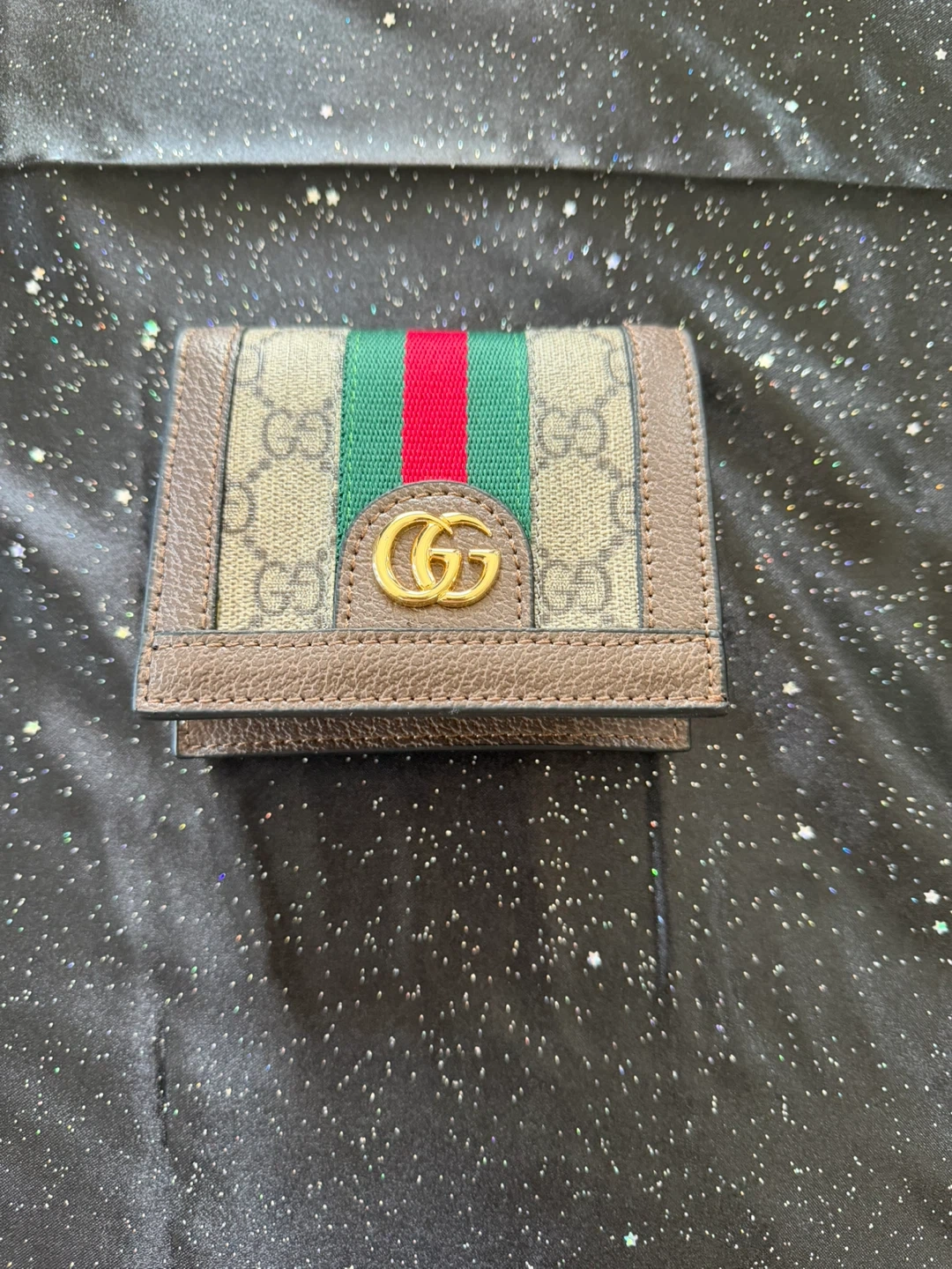 A compact Gucci Ophidia wallet with the signature GG Supreme canvas. It features the iconic green and red stripe and gold Double G hardware. This wallet is great for everyday use, keeping your essentials organized.