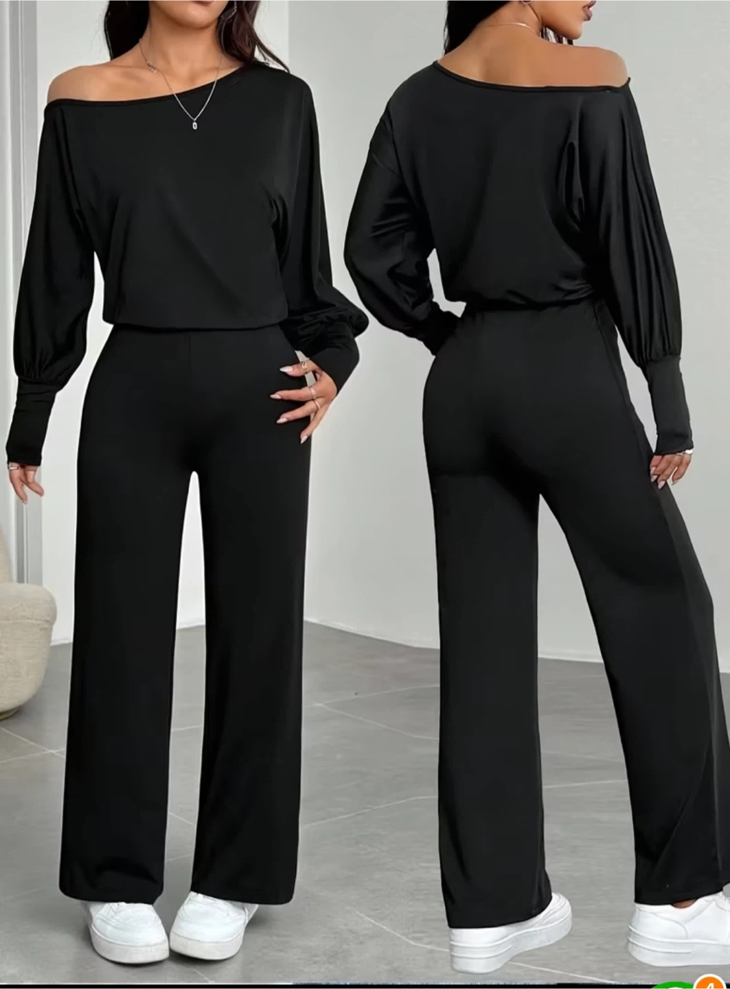 New, unworn, black jumpsuit features an off-the-shoulder neckline and blouson sleeves. Size M. It has a comfortable wide-leg silhouette. Made from a soft, flowy fabric.