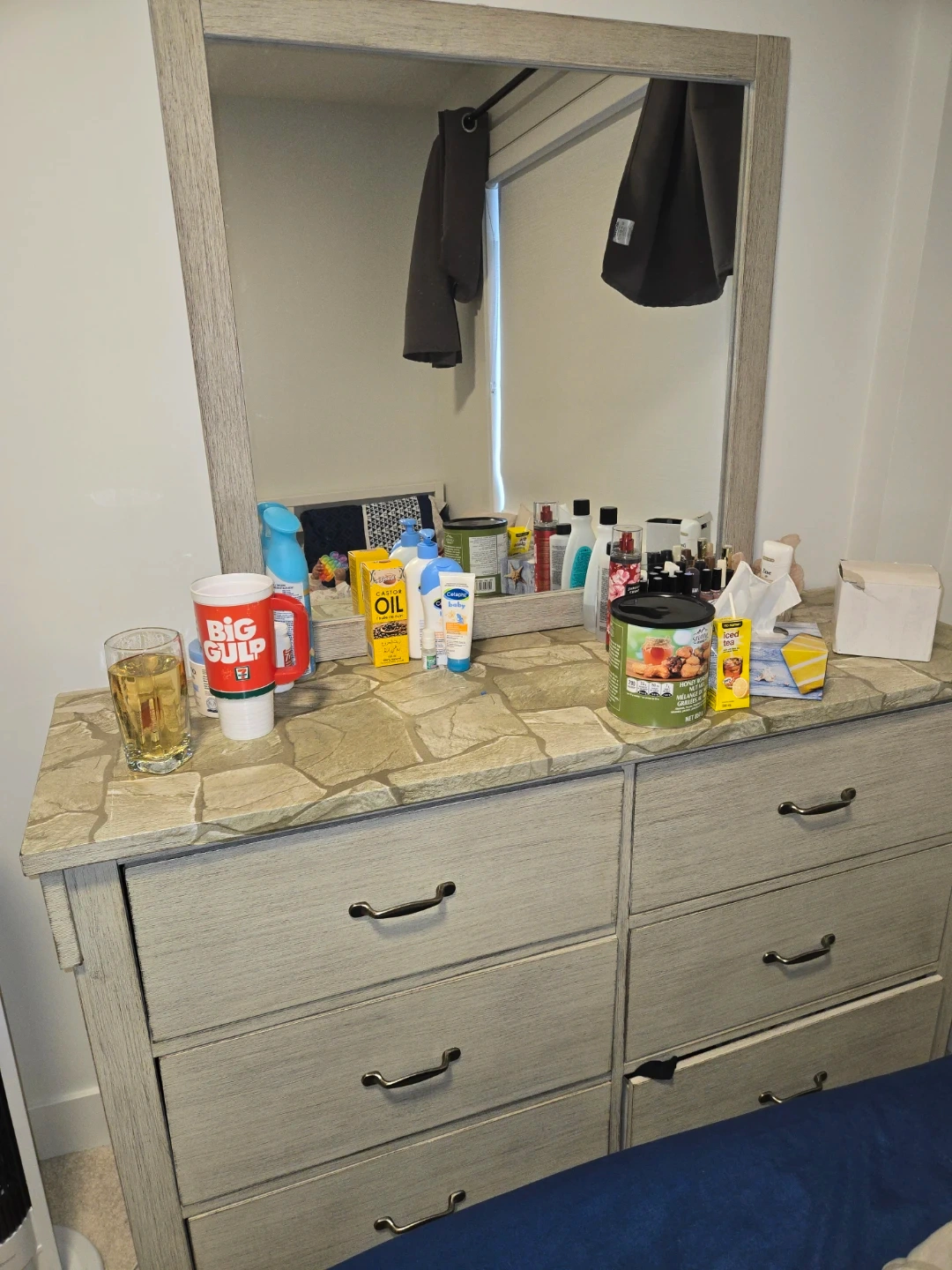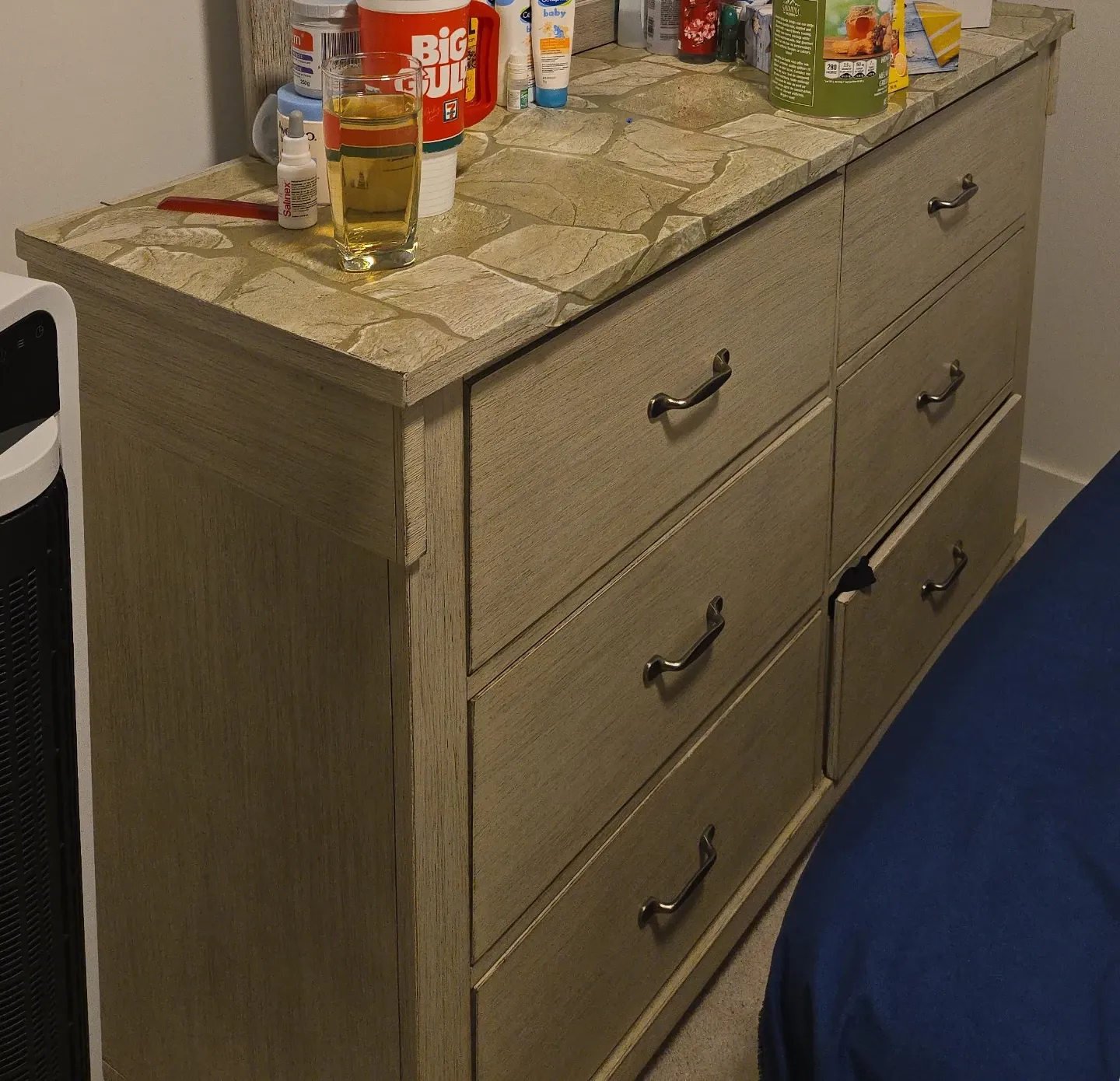 This is a six-drawer dresser with a stone-patterned top and a matching mirror. It's made of light wood and has metal drawer pulls. The dresser is a neutral colour, fitting well in many bedroom decors.