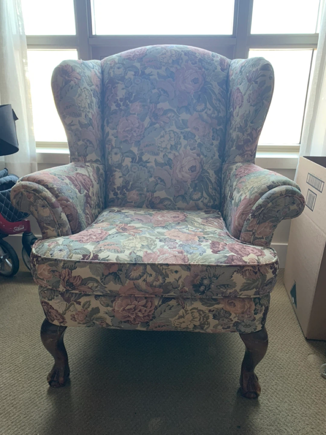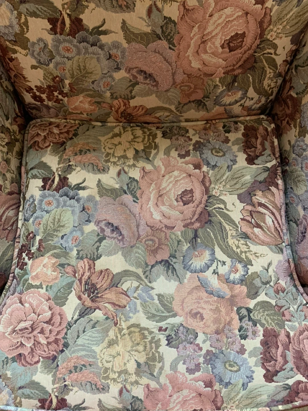This armchair features a classic floral upholstery pattern. Its wingback design and upholstered arms offer a cozy feel. The chair has wooden legs and is a comfortable accent piece for any room.