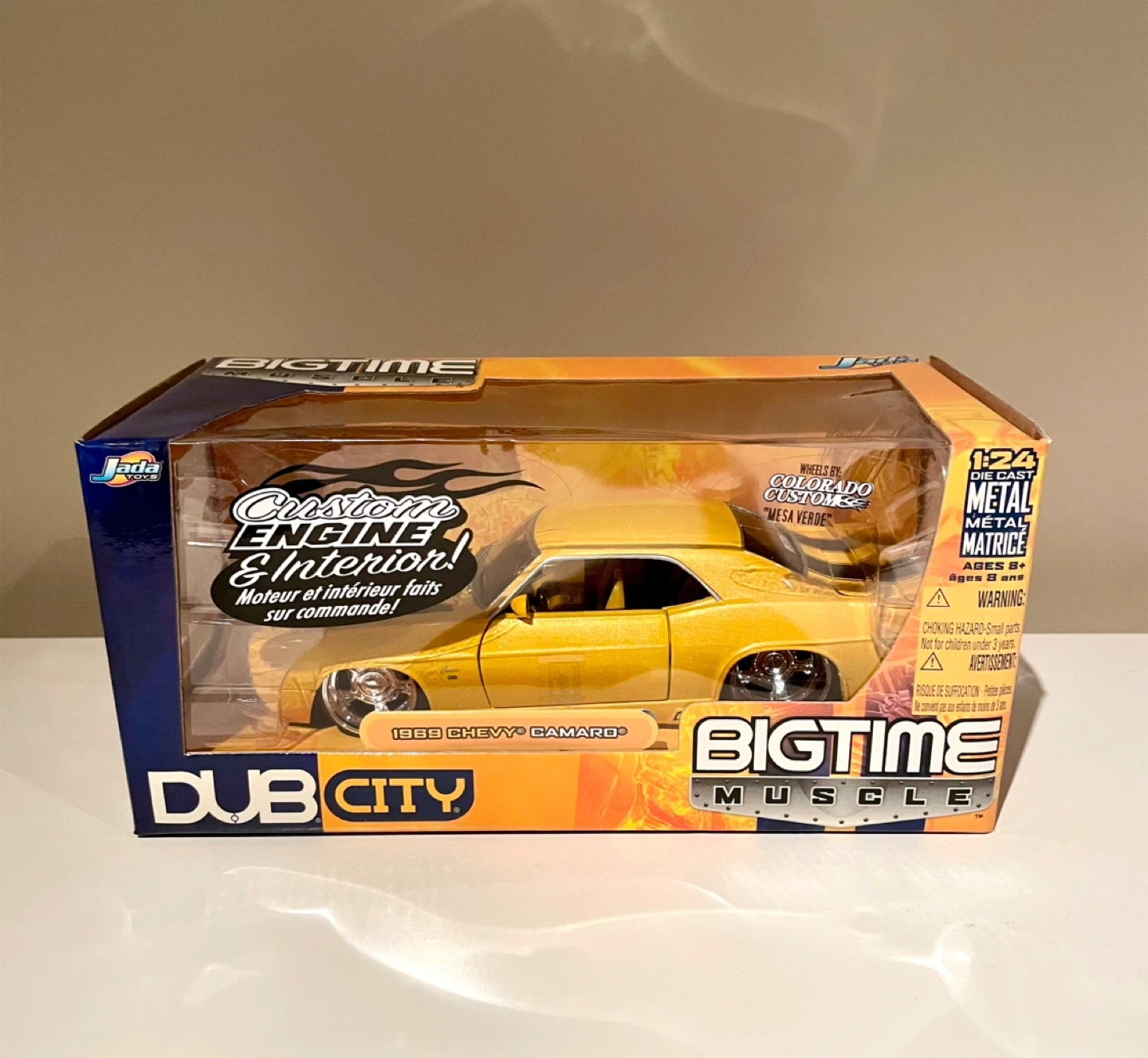This is a Jada Toys 1:24 scale 1969 Chevrolet Camaro die-cast model from the "Bigtime Muscle" and "DUB City" series.