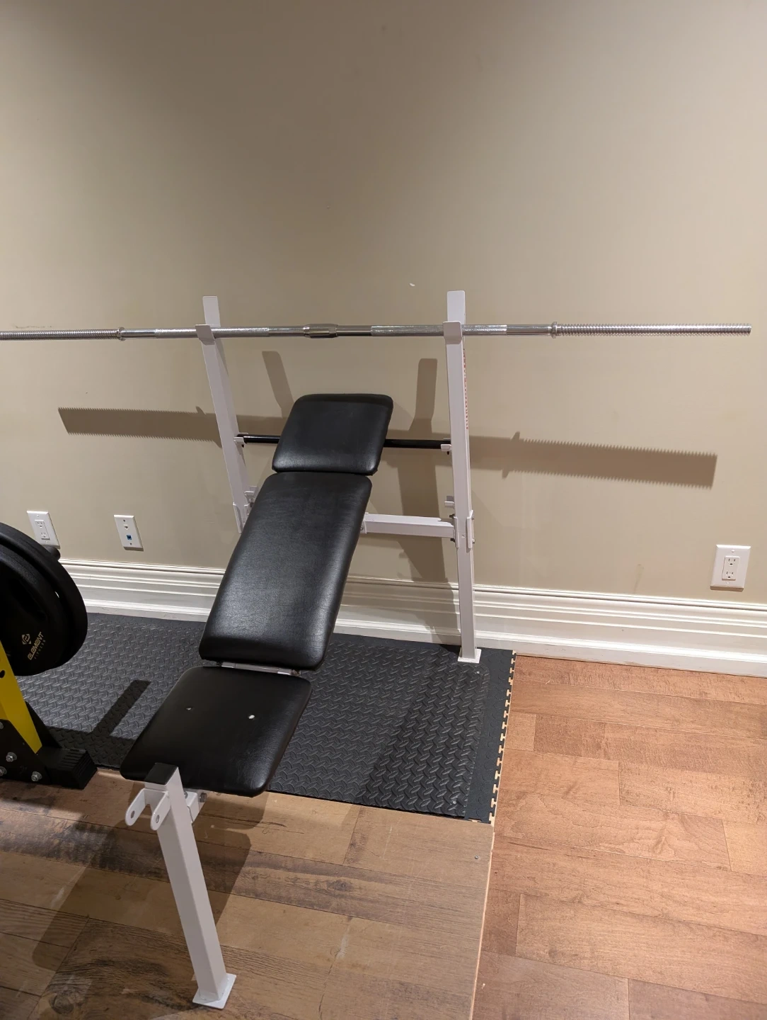 Complete home gym setup featuring a yellow and black fitness power rack with pull-up bar and a white adjustable bench press. Includes barbells, bars and weight plates. Great for a full-body workout!