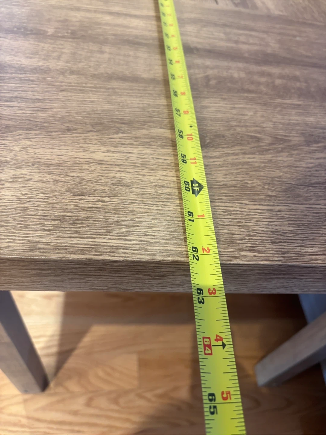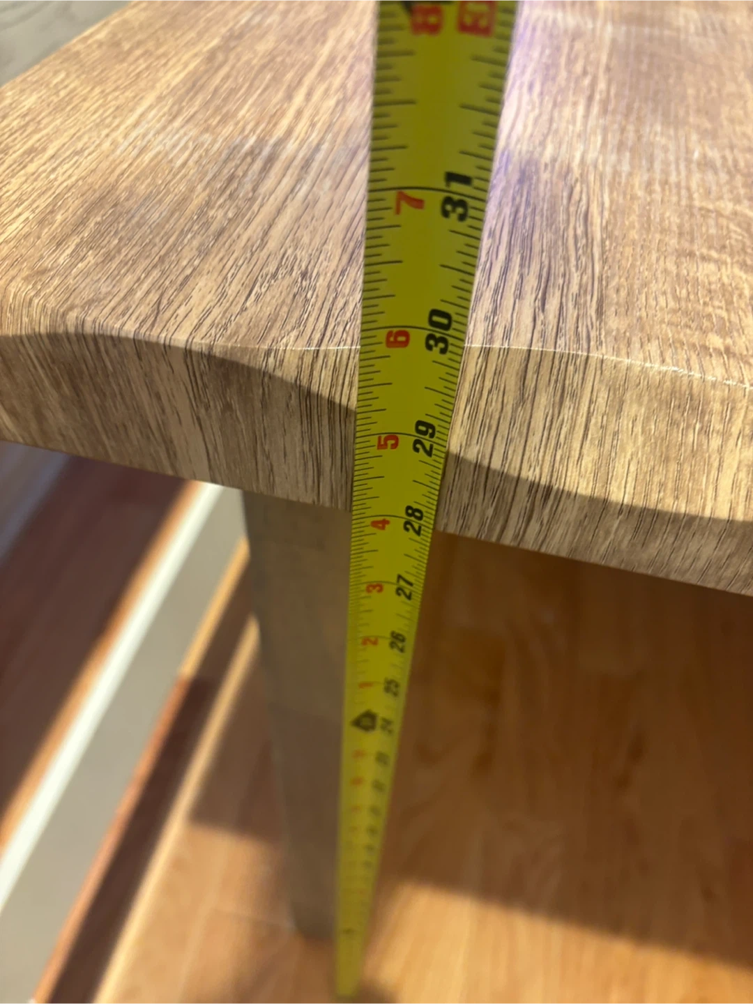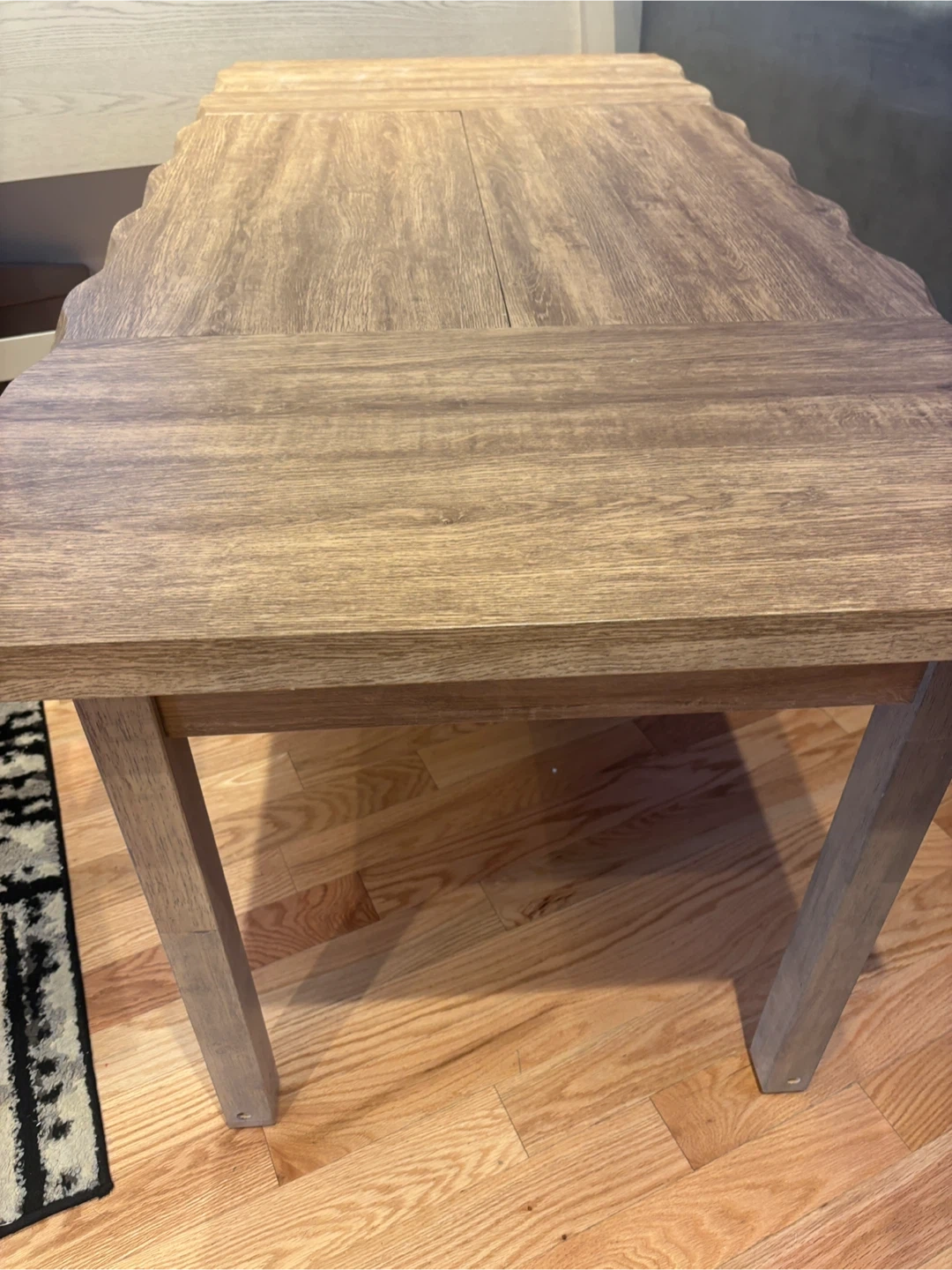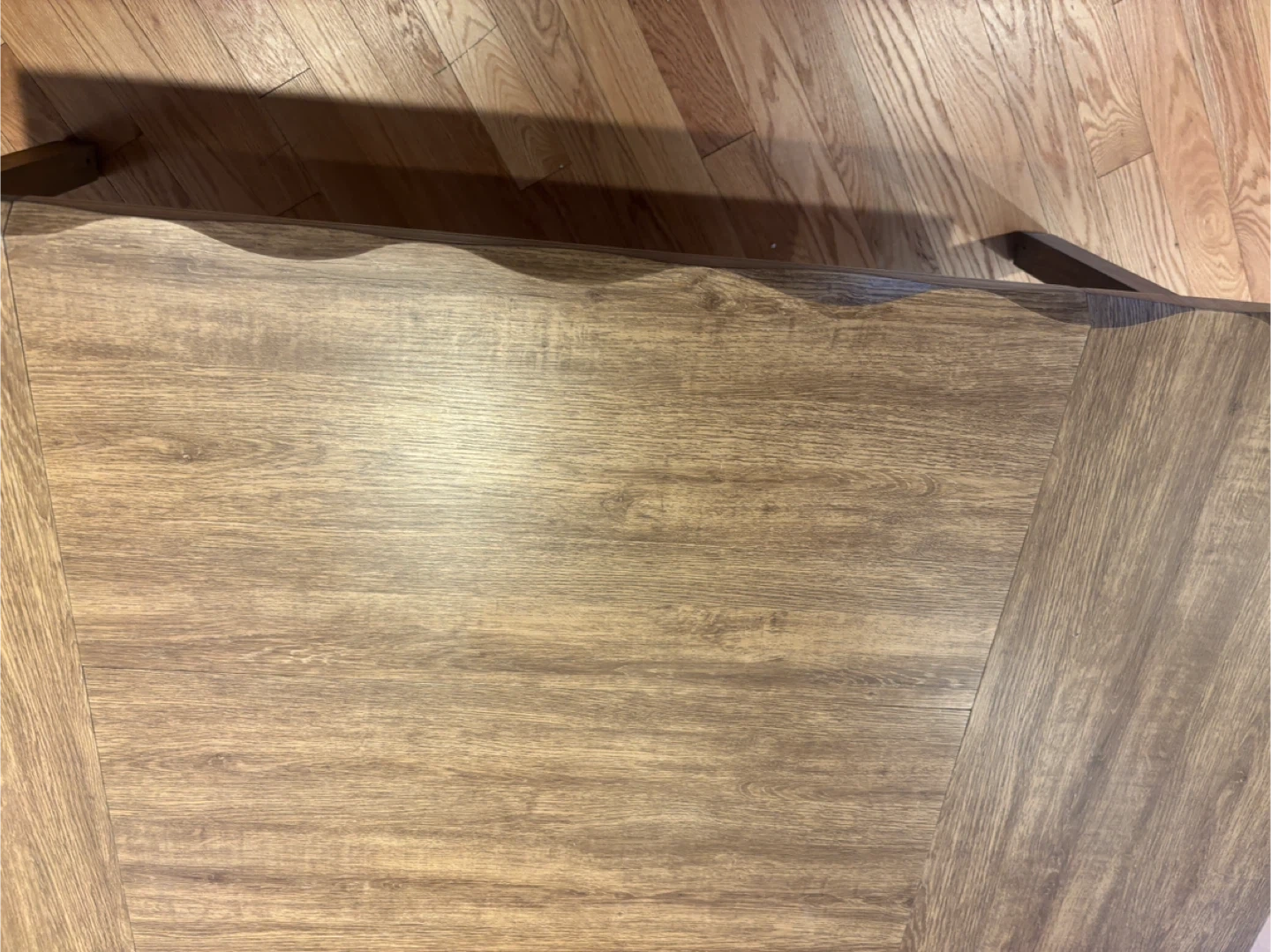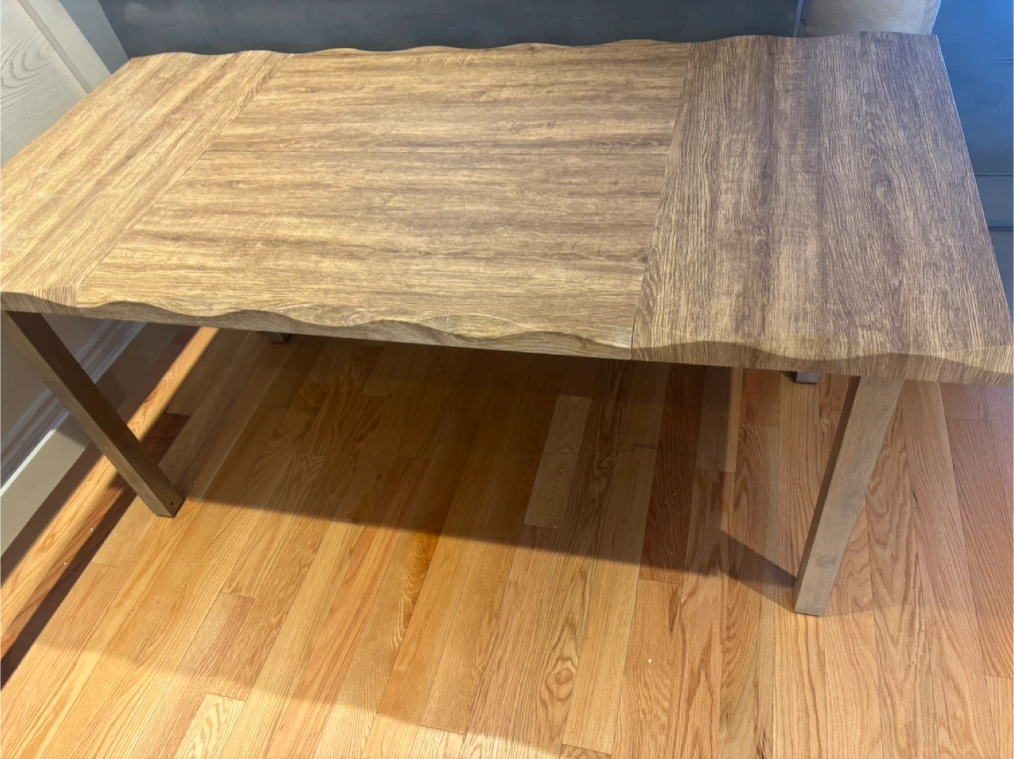A sturdy wooden dining/Computer table with a curved wood finish. It has a wavy edge detail and a drop leaf extension. The table measures 30 inches in height.
