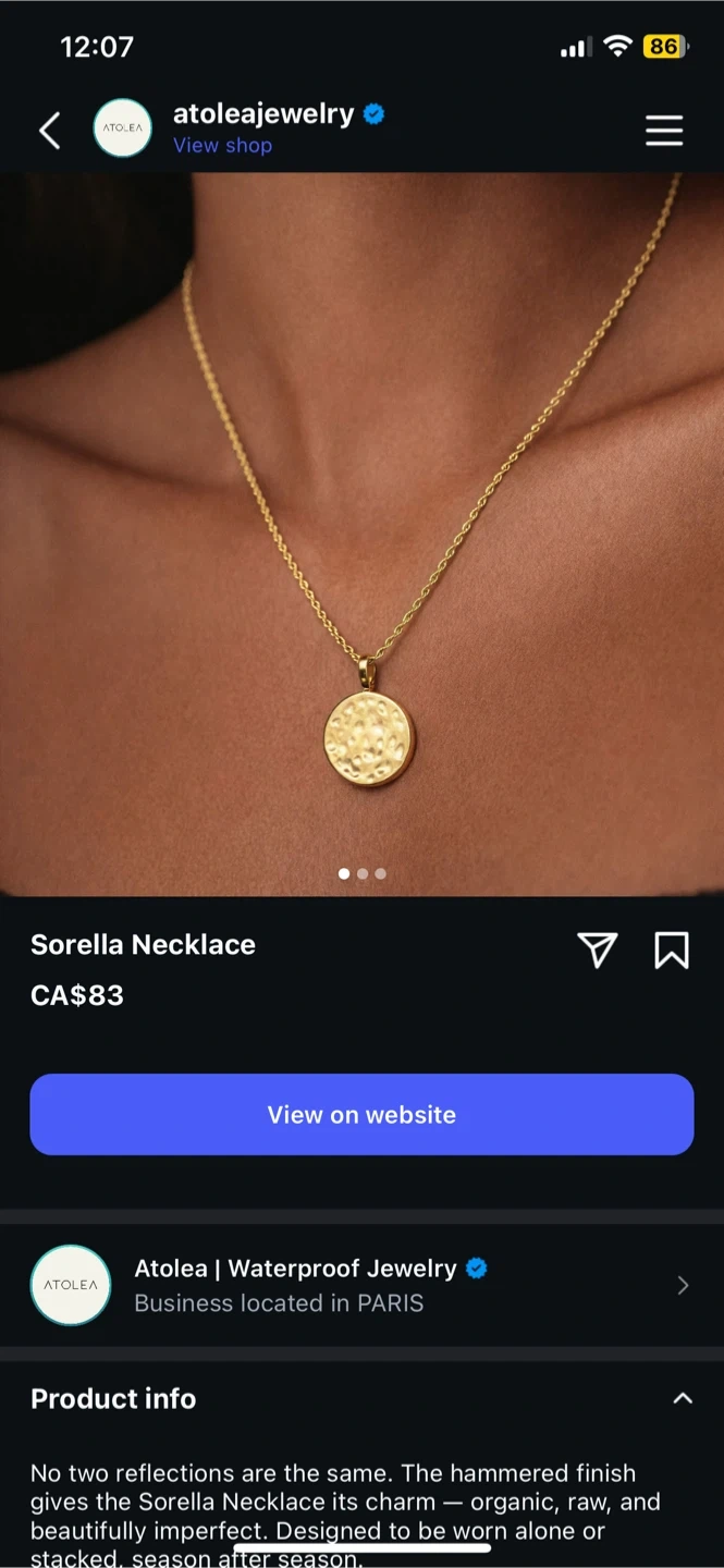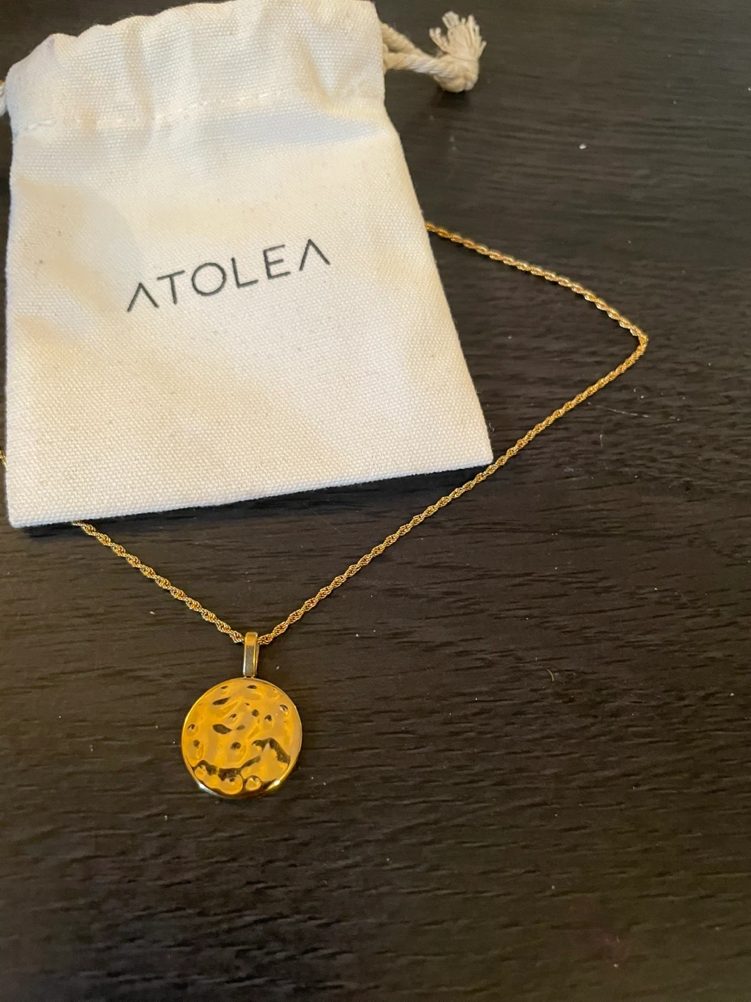 This is the Atolea Sorella Necklace. It features a hammered gold-toned pendant with a unique, organic texture. Comes with its original pouch. Waterproof jewelry.