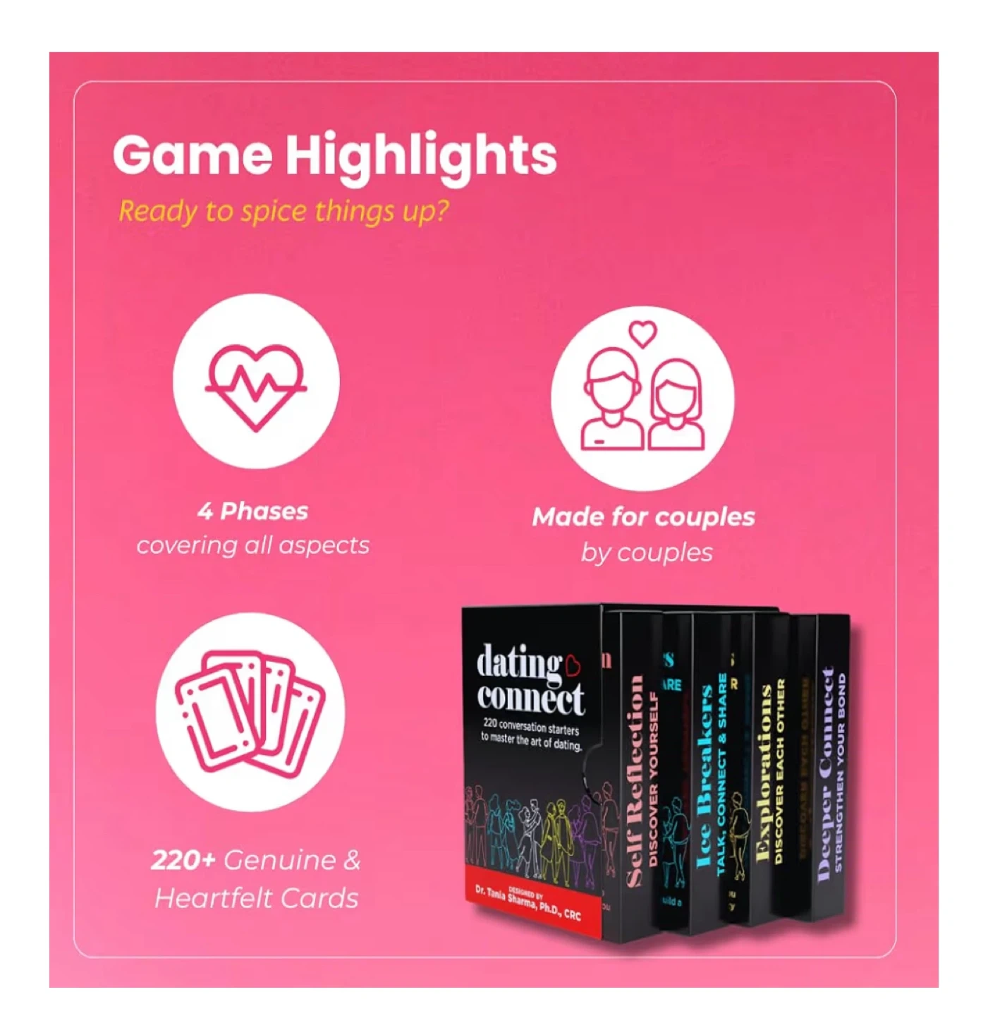 Dating Connect offers 220 conversation starters designed to deepen relationships. It's divided into four phases: Ice Breakers, Self Reflection, Explorations, and Deeper Connect. This game helps couples talk, connect, and share. It's great for building a stronger bond!