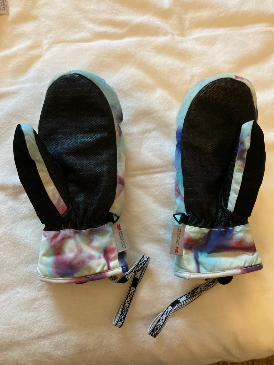 Selling a pair of DC snowboarding mittens. They're in great shape and ready for the slopes! Tie dye design, mint condition, perfect for keeping your hands warm and dry while you enjoy your winter adventures.