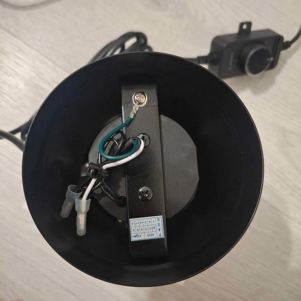 The inline variable speed controller can control the can fan’s speed and turn it on or off. Turning the knob will increase or decrease the fan speed and optimize airflow and noise levels for your application. Its speed range includes a low, medium, and high threshold, producing up to 106 CFM and 28 dBA in noise.
