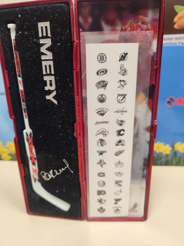 Selling a NHL Star Sticks mini hockey stick featuring Ray Emery. It comes in a red case with a list of NHL team logos. Great for any hockey fan! More options available as well .