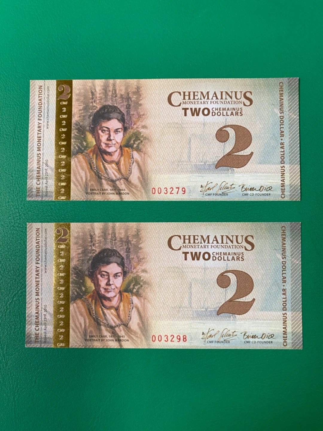 Two Chemainus Monetary Foundation Two Dollar Bills. Features a portrait of Emily Carr by John Mardon and a marine scene on the reverse. Serial numbers 003279 and 003298. These bills have a collectible value.