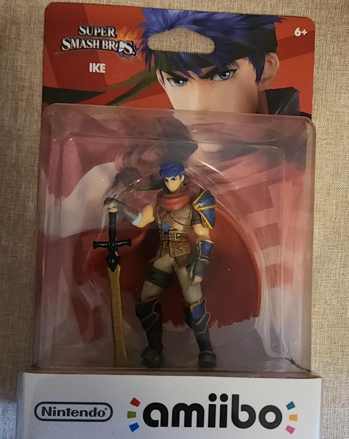 This is a Nintendo Amiibo figure of Ike from Super Smash Bros. It's still in its original packaging. The figure depicts Ike holding his sword, ready for action!