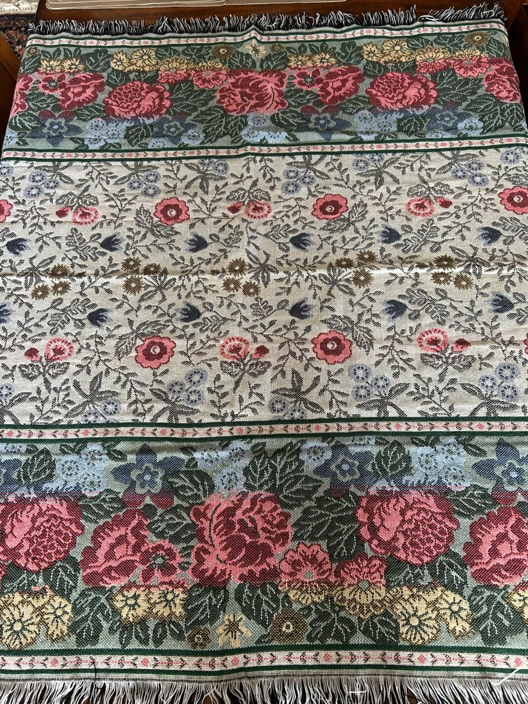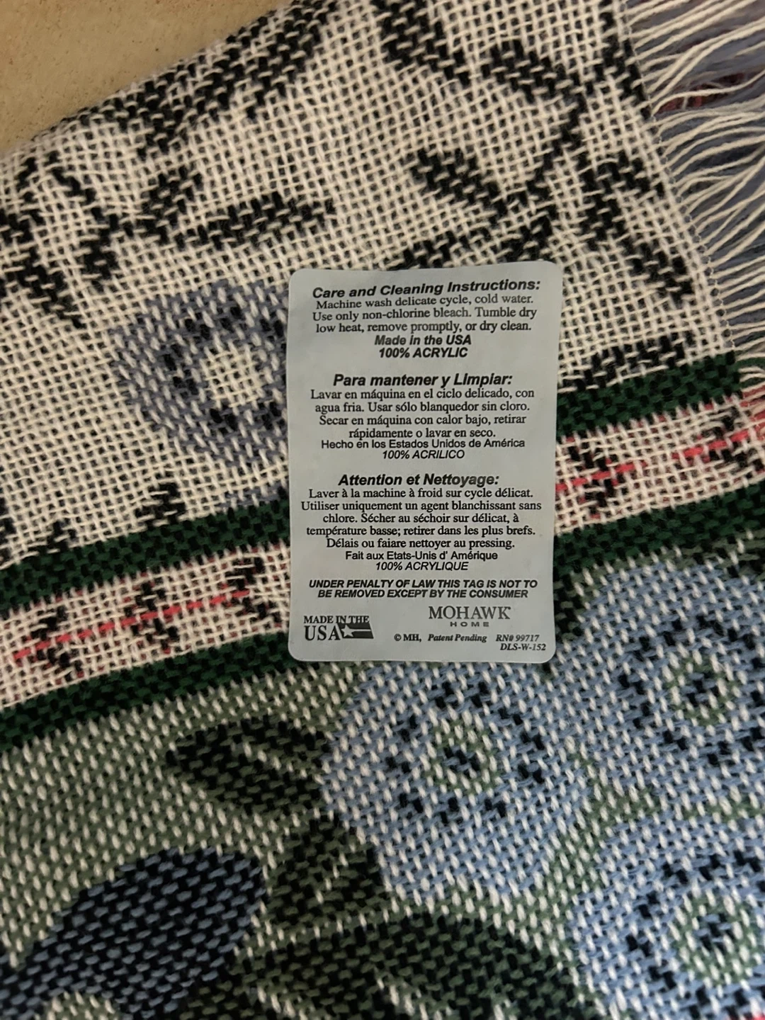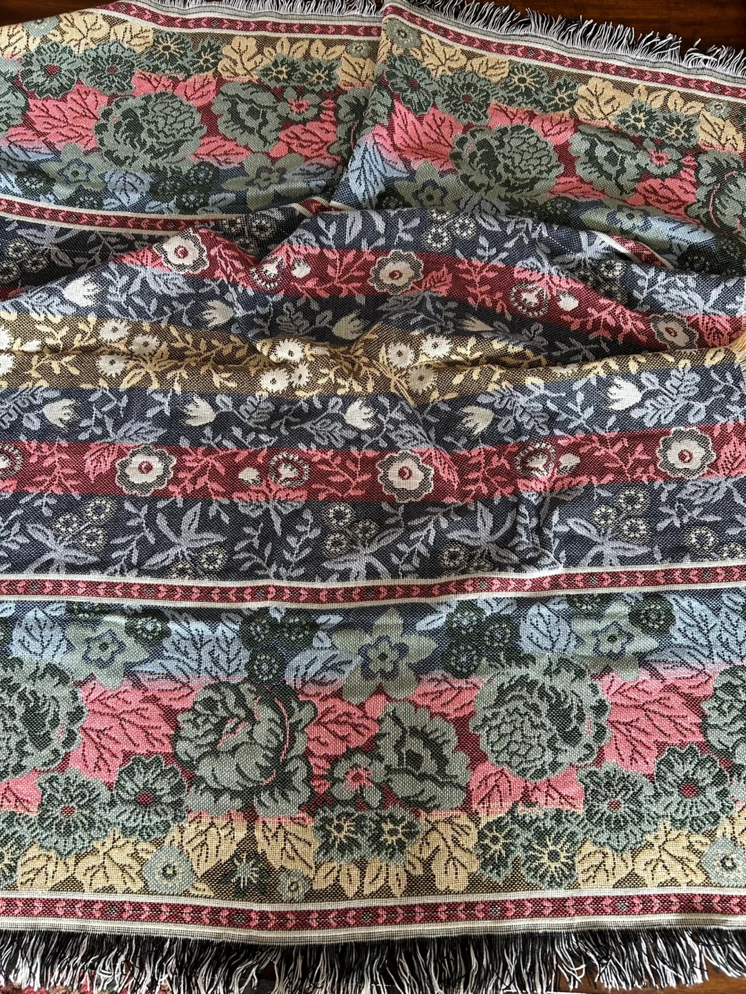 This is a lovely floral tapestry throw blanket from Mohawk Home. It's made of 100% acrylic and features a beautiful, classic floral pattern with fringed edges. Perfect for adding a cozy, decorative touch to your sofa or bed!