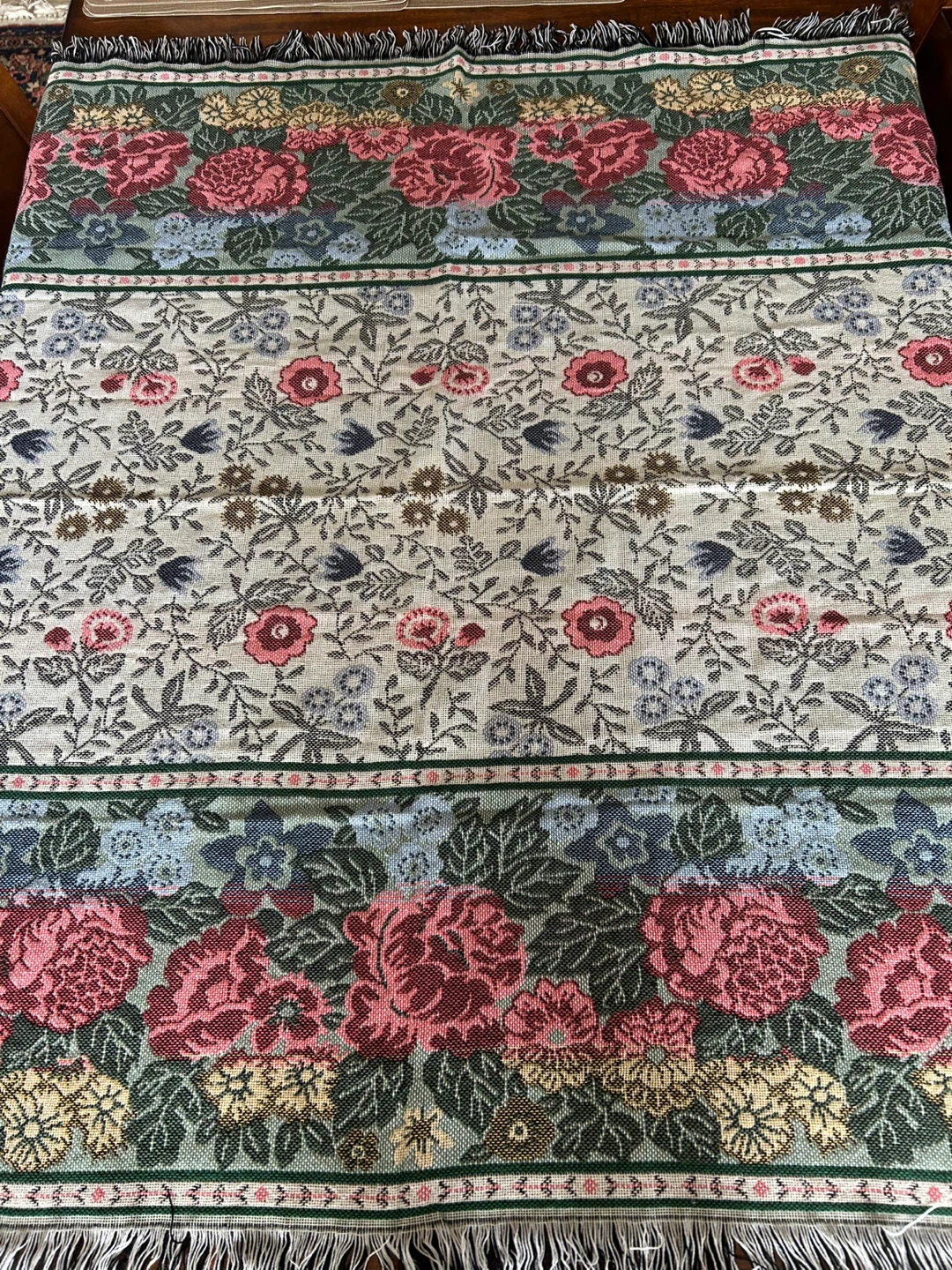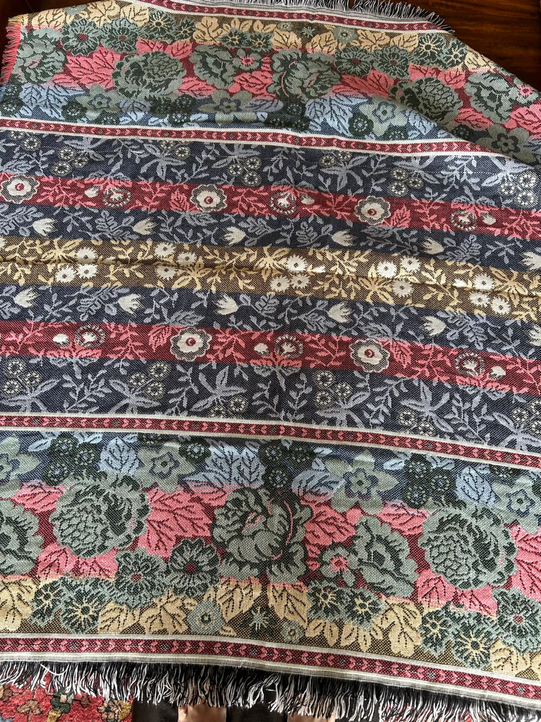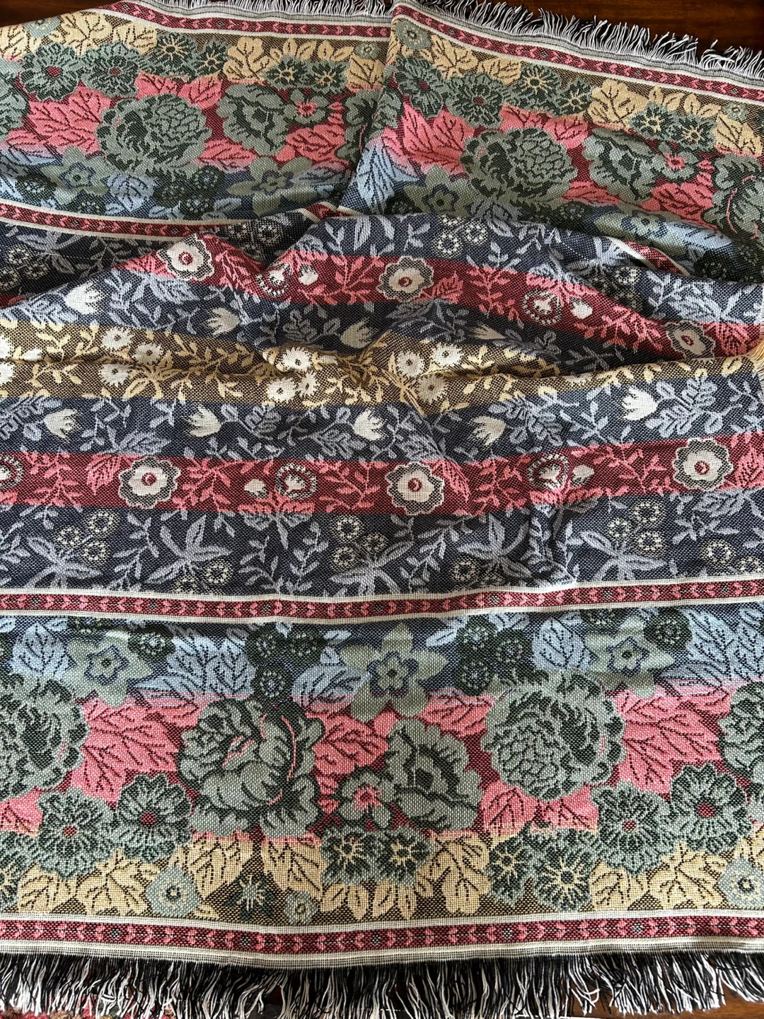 This is a lovely floral tapestry throw blanket from Mohawk Home. It's made of 100% acrylic and features a beautiful, classic floral pattern with fringed edges. Perfect for adding a cozy, decorative touch to your sofa or bed!