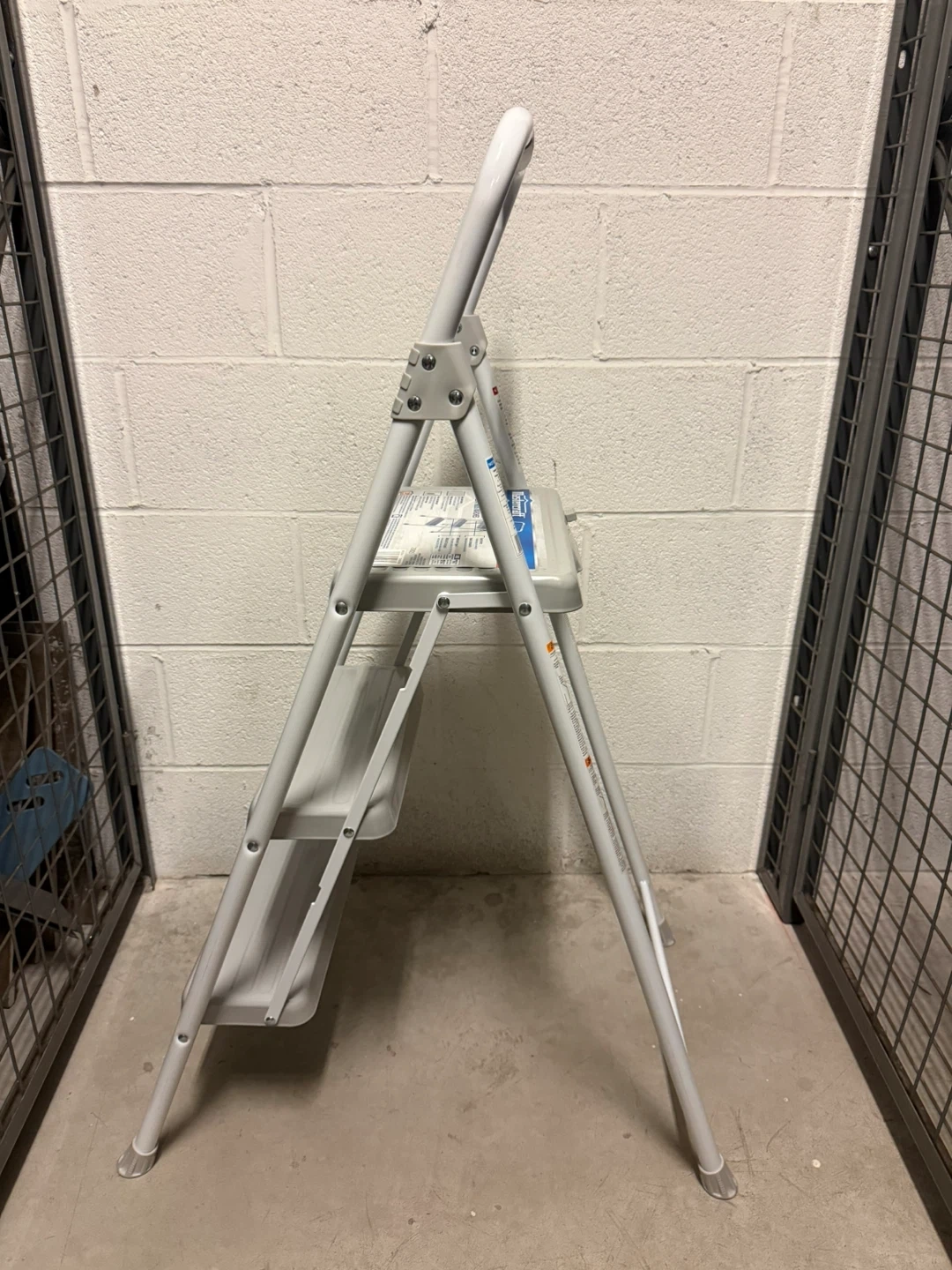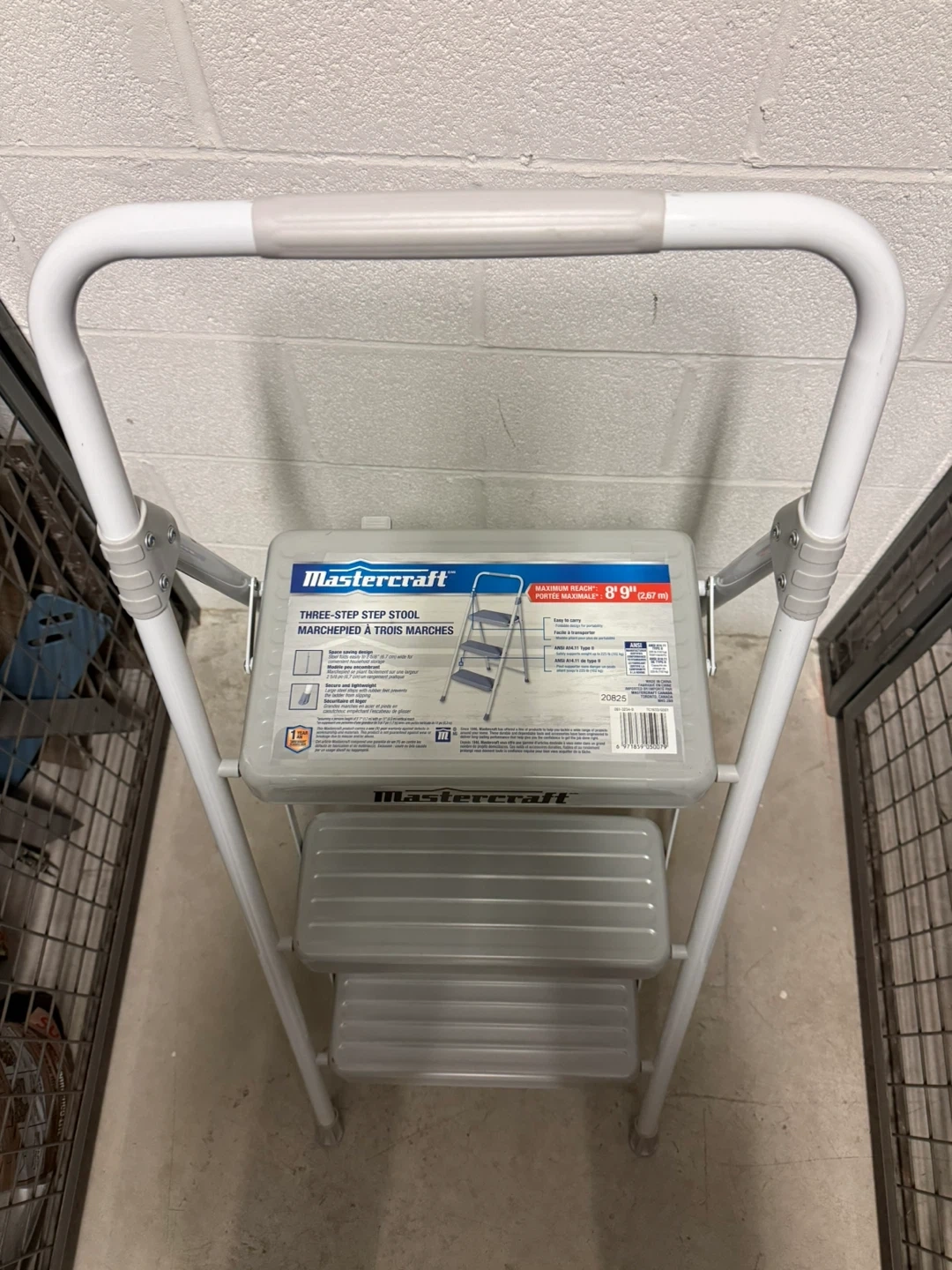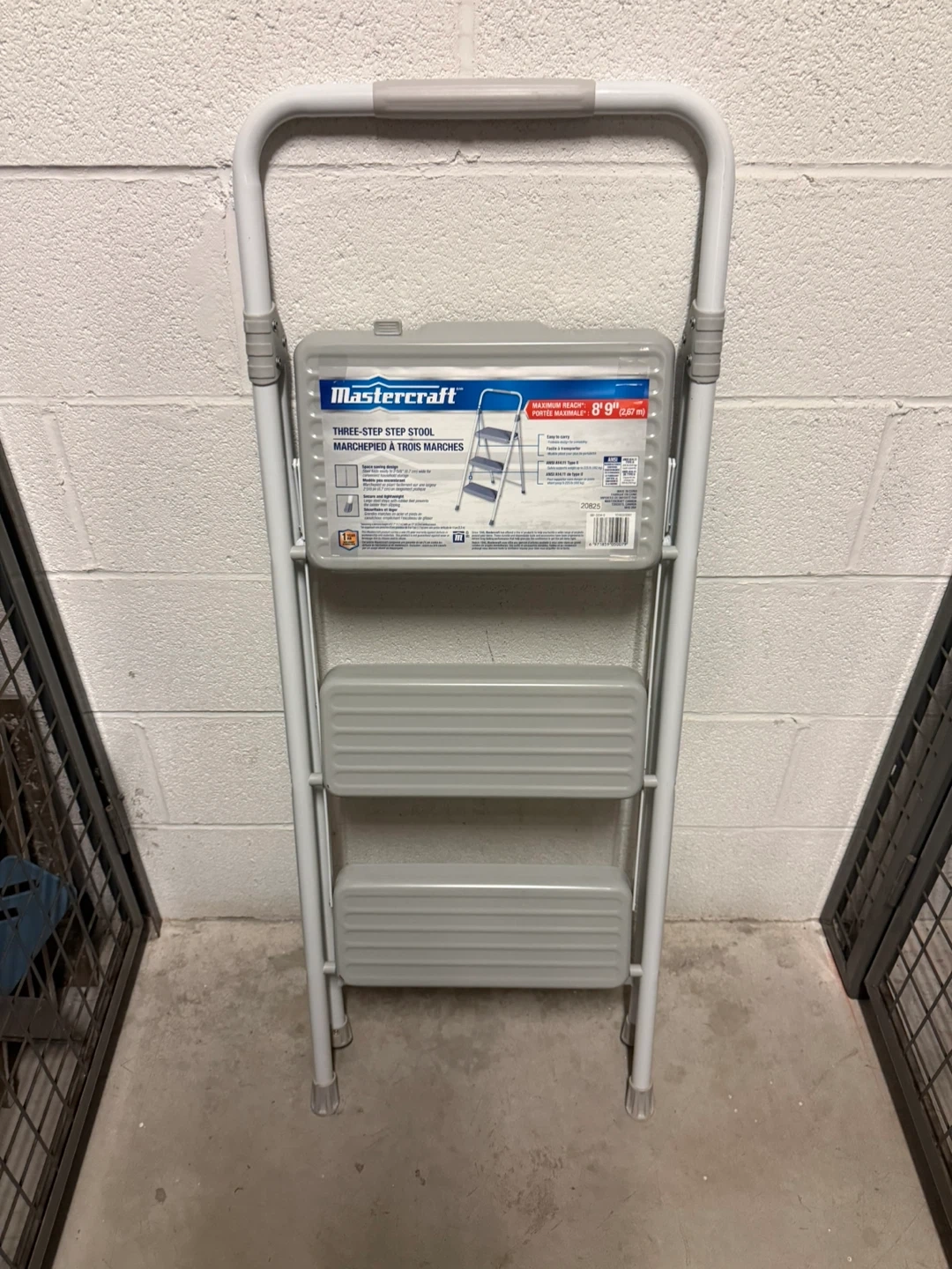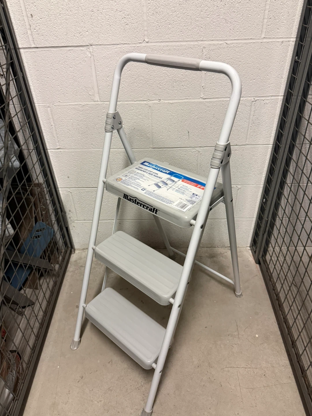This is a Mastercraft three-step folding stool. It features a sturdy metal frame with non-slip treads on each step. The stool folds flat for easy storage.