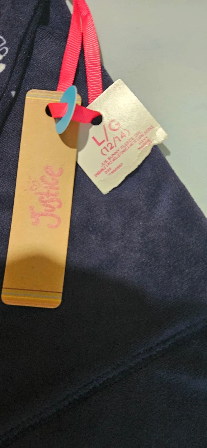 This navy velour sleep set features the "Low Key" graphic on the front with "Justice" repeated on the sleeves. It's a size L/G (12/14). Made with 75% polyester and 25% recycled polyester. Elastic waistband on pants.