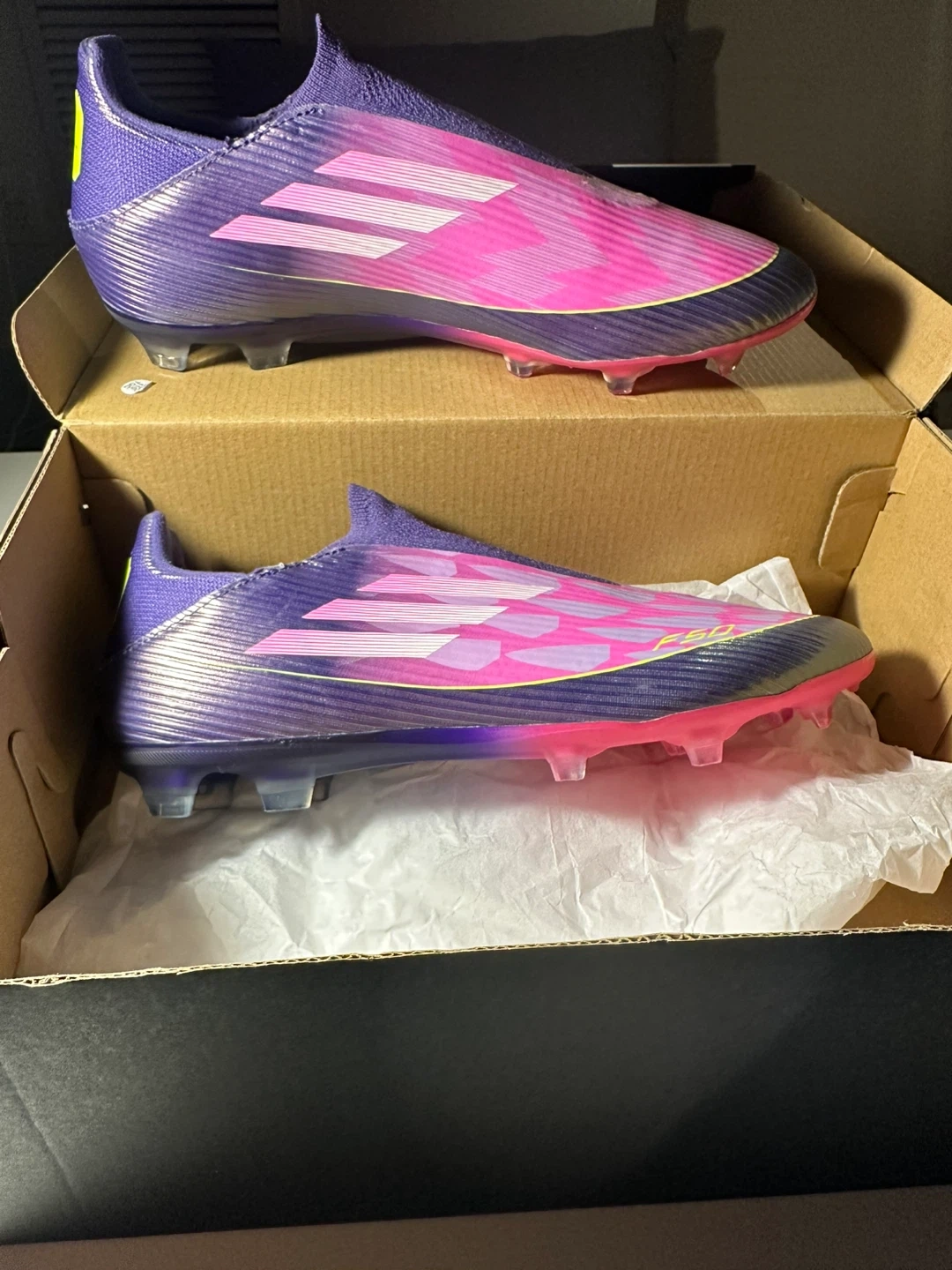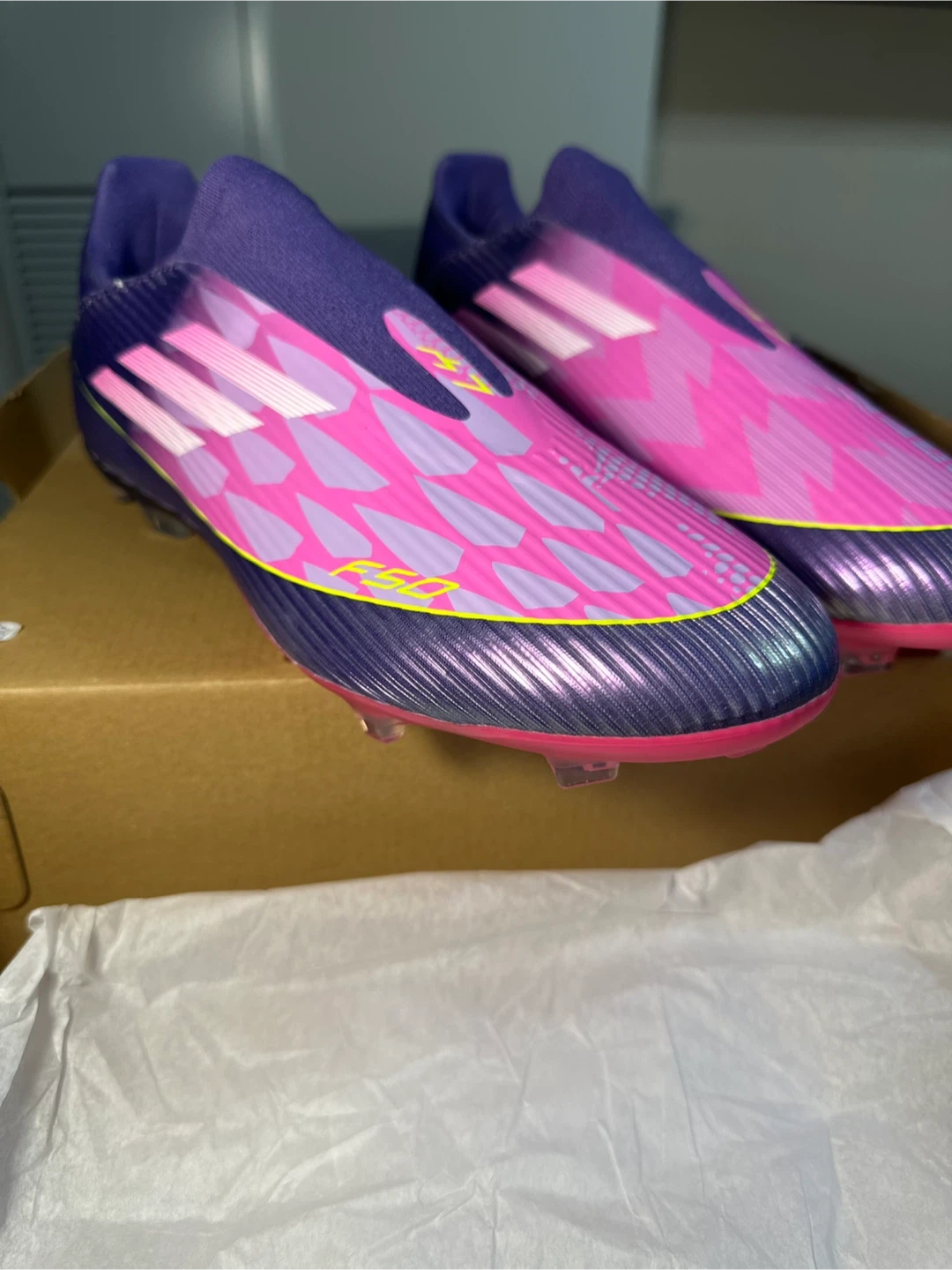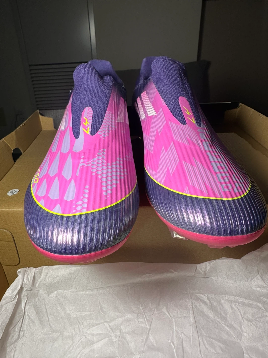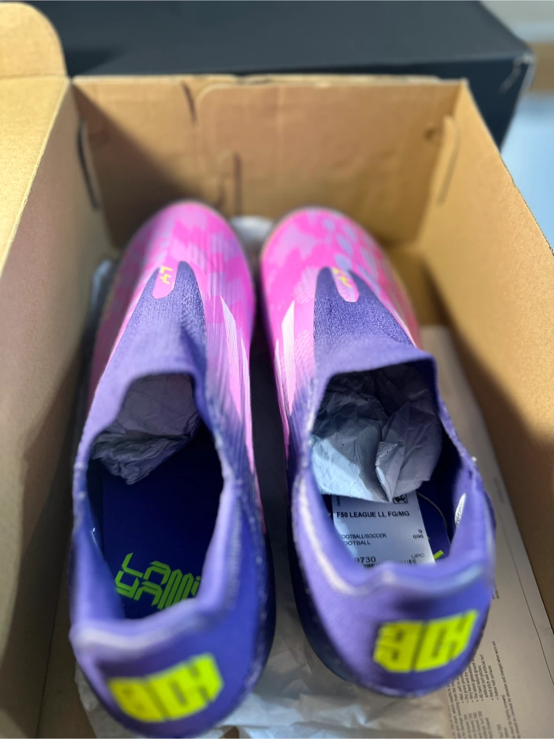 Selling a pair of Adidas lamine yamal LL FG/MG soccer cleats. They come in a vibrant pink and purple colourway. These cleats are designed for football/soccer and feature a laceless design. Comes with the original box!