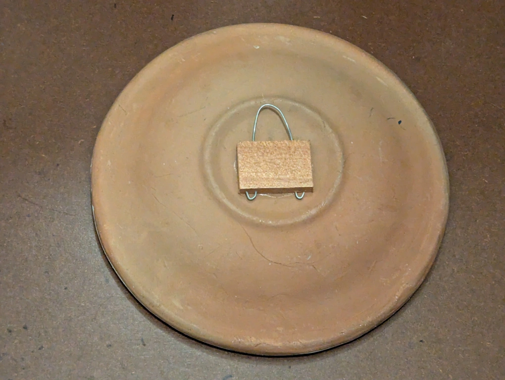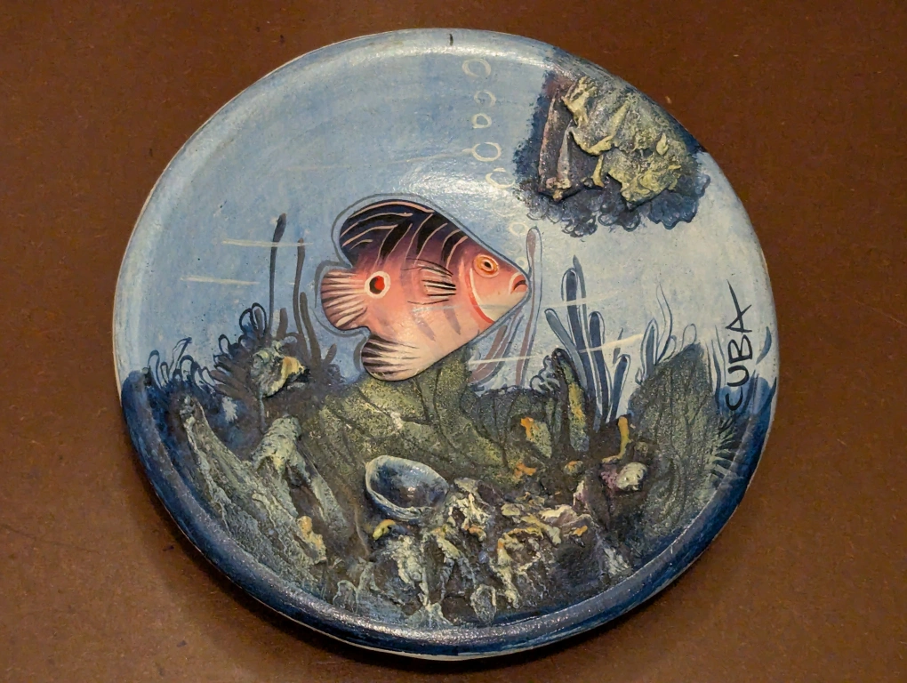 Hand painted terracotta decorative plate, 6.25" in diameter, with a wall hook on the back. The image features a pink fish in a blue underwater scene. Made in Cuba.