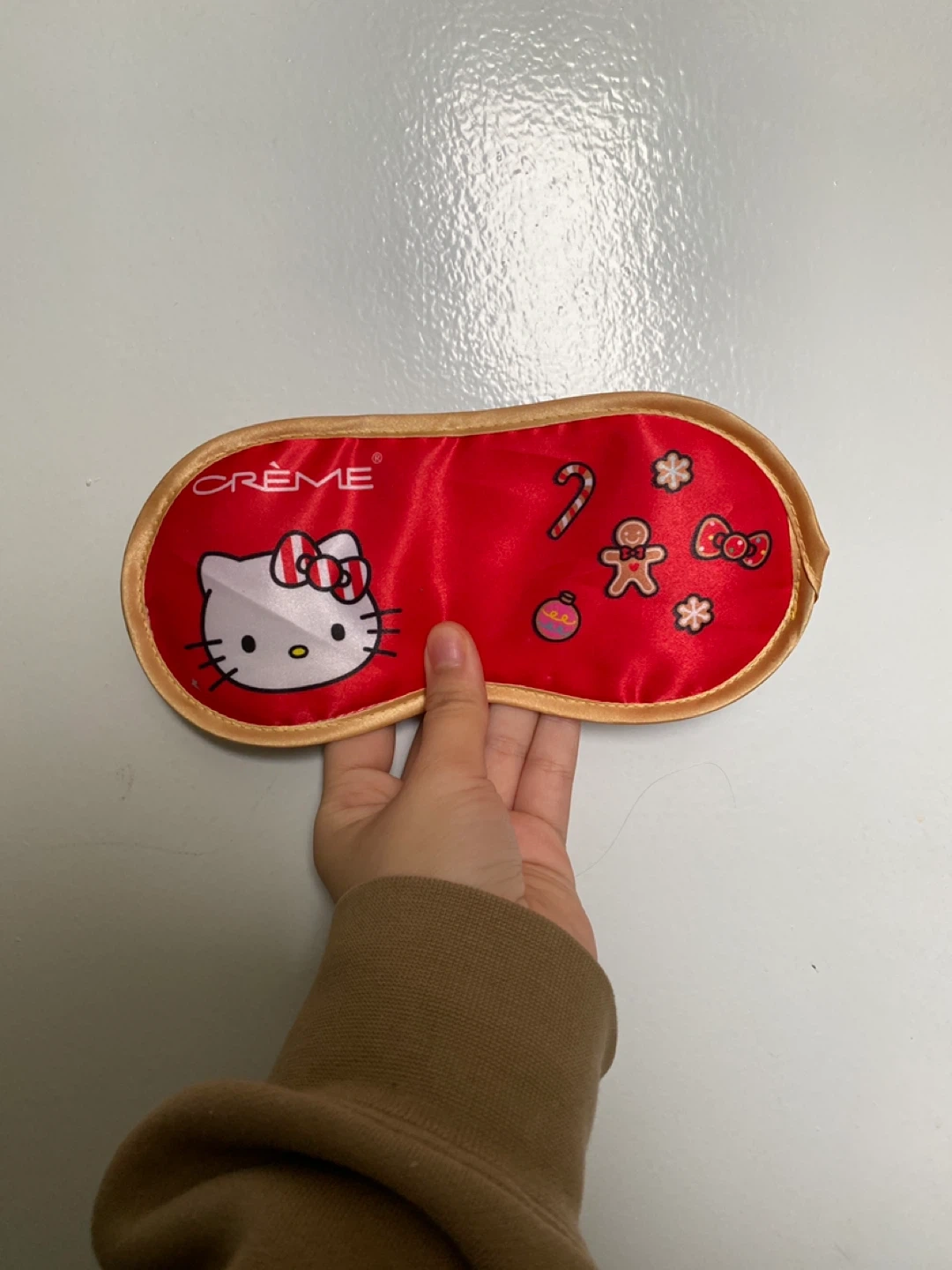 This is a The Crème Shop x Hello Kitty sleep mask. It's a festive red colour with Hello Kitty and holiday graphics. Elastic strap for a comfortable fit. Great for blocking out light during travel or naps!