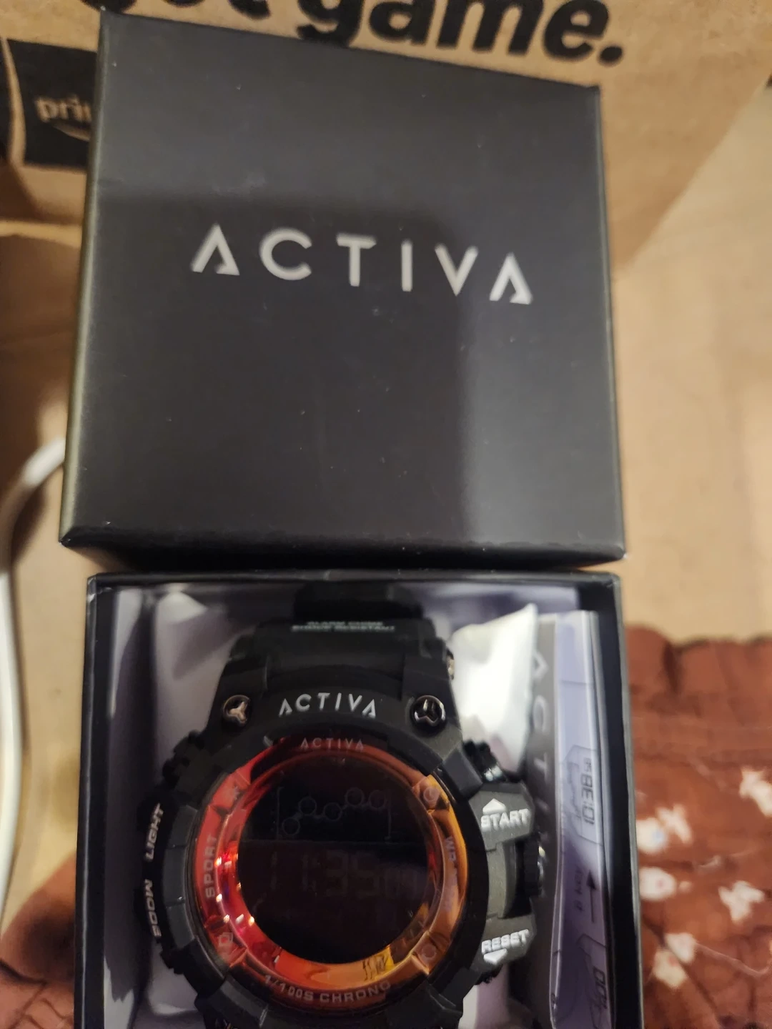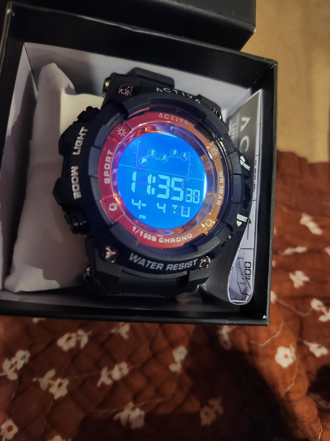 This is an Activa digital sports watch. It's black with a red and blue illuminated display. Features water resistance and a chronograph function. Includes the original box and manual.