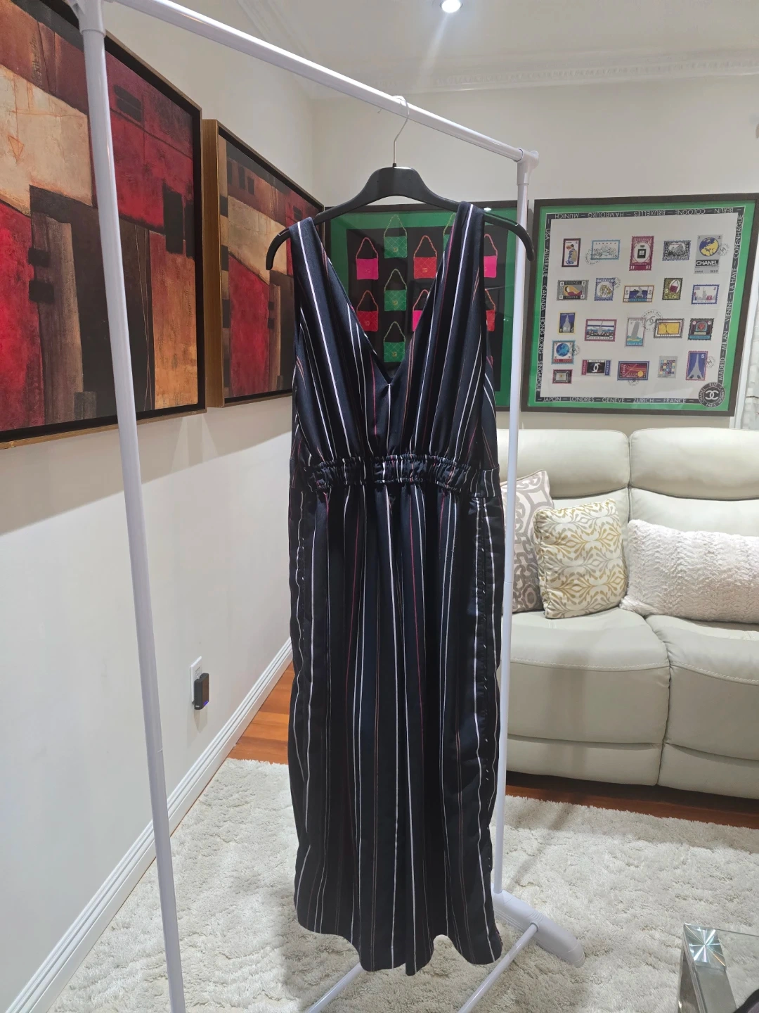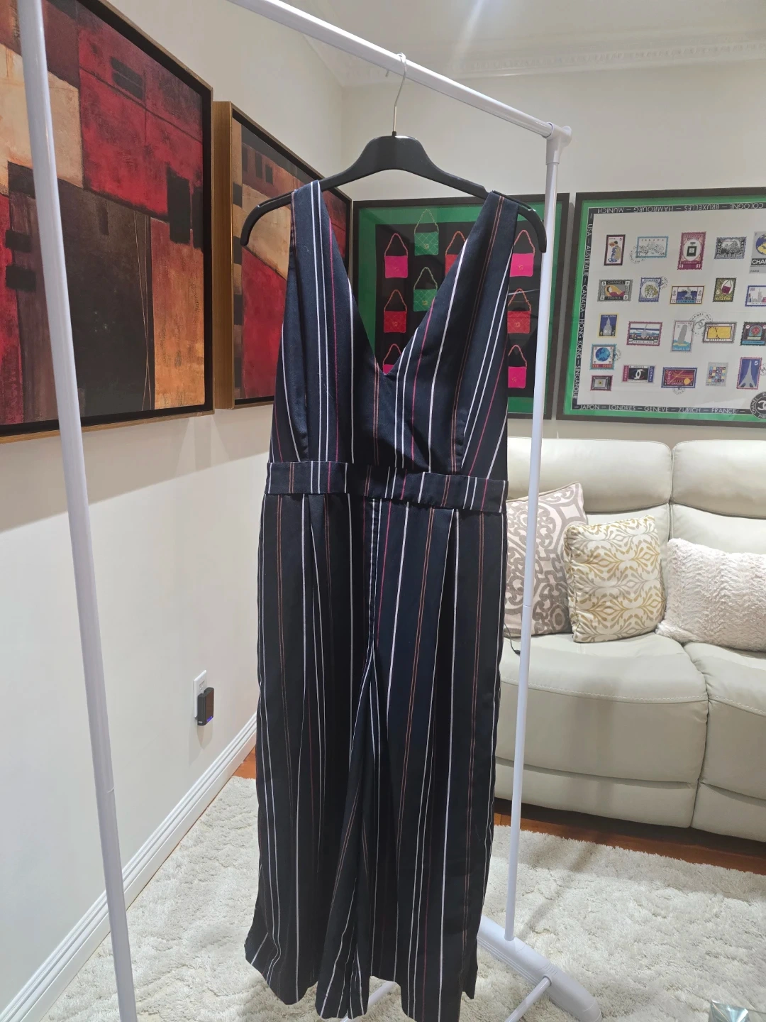 This Frank + Oak jumpsuit features a black base with multicoloured vertical stripes. It's a size large with an elasticated waist. The fabric appears to be a lightweight material, perfect for all seasons.