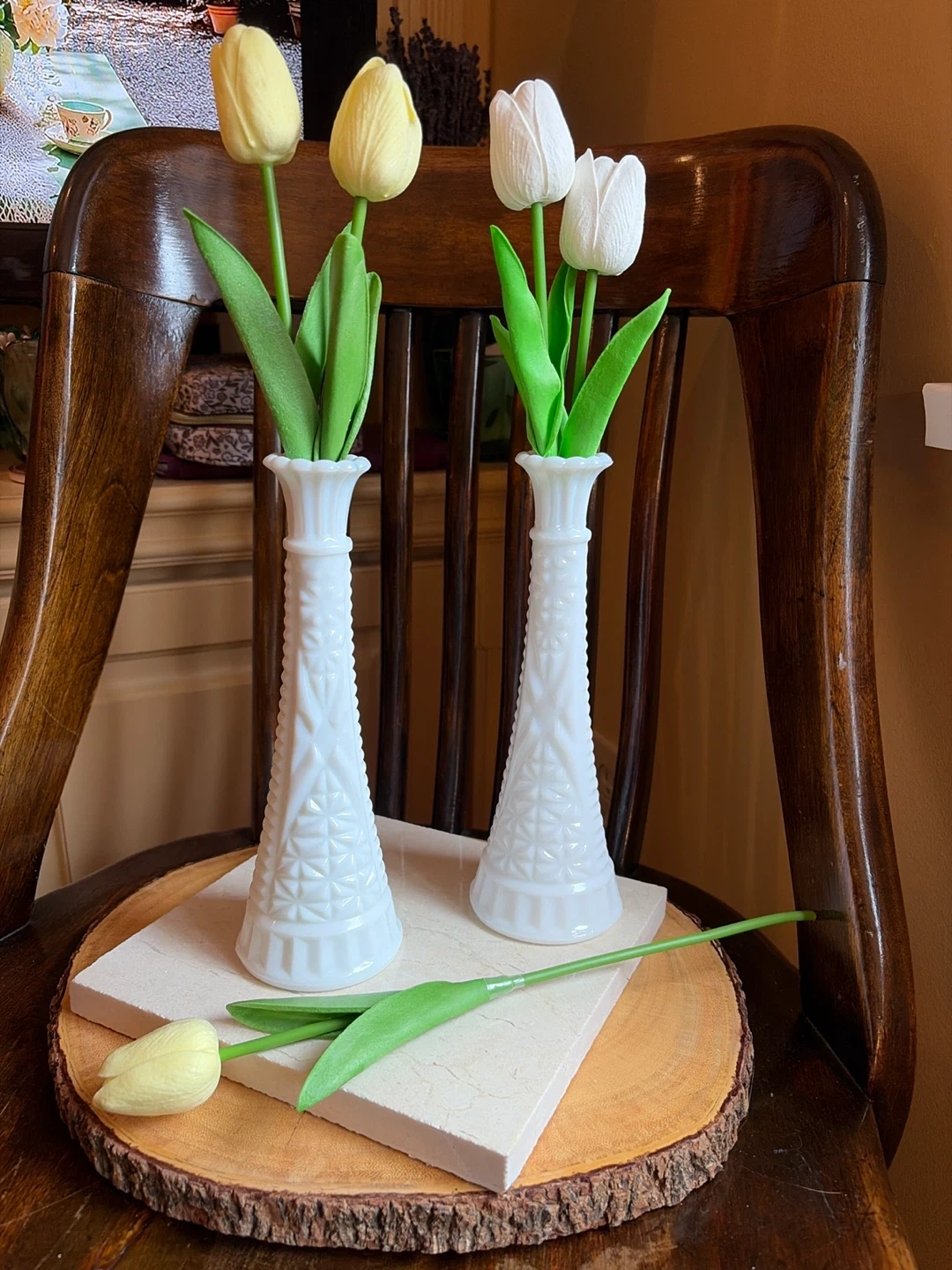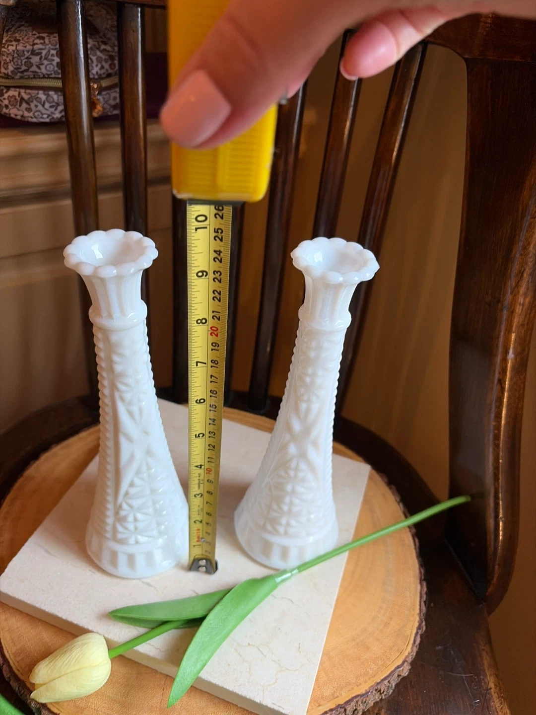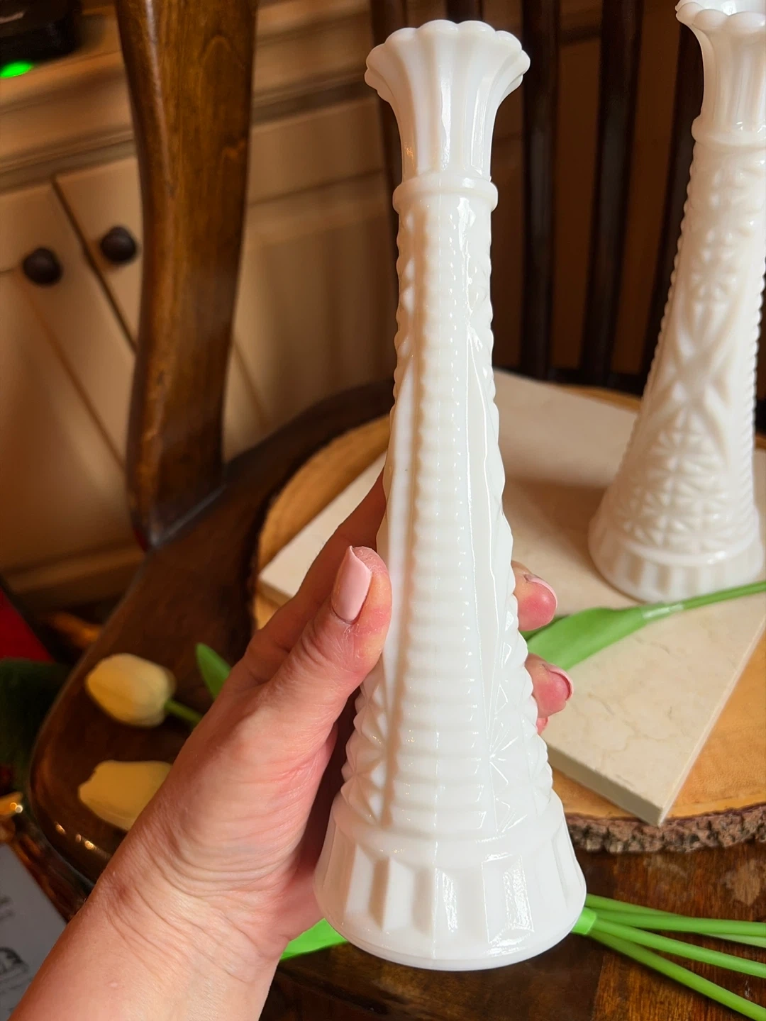 Two elegant vintage Anchor Hocking white milk glass vases with a textured pattern called Stars and Bars. These vases stand tall at 10β and have a flared rim. They're perfect for displaying flowers in any room and go with any decor colour scheme. No chips or cracks. Ready for some beautiful flowers for your tablescape! π·π·π·