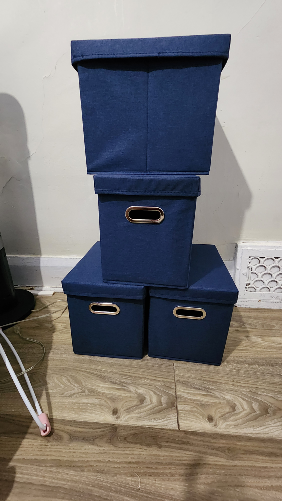 Four navy blue storage boxes. Feature lids and metal handles. Great for decluttering and creating a peaceful space.