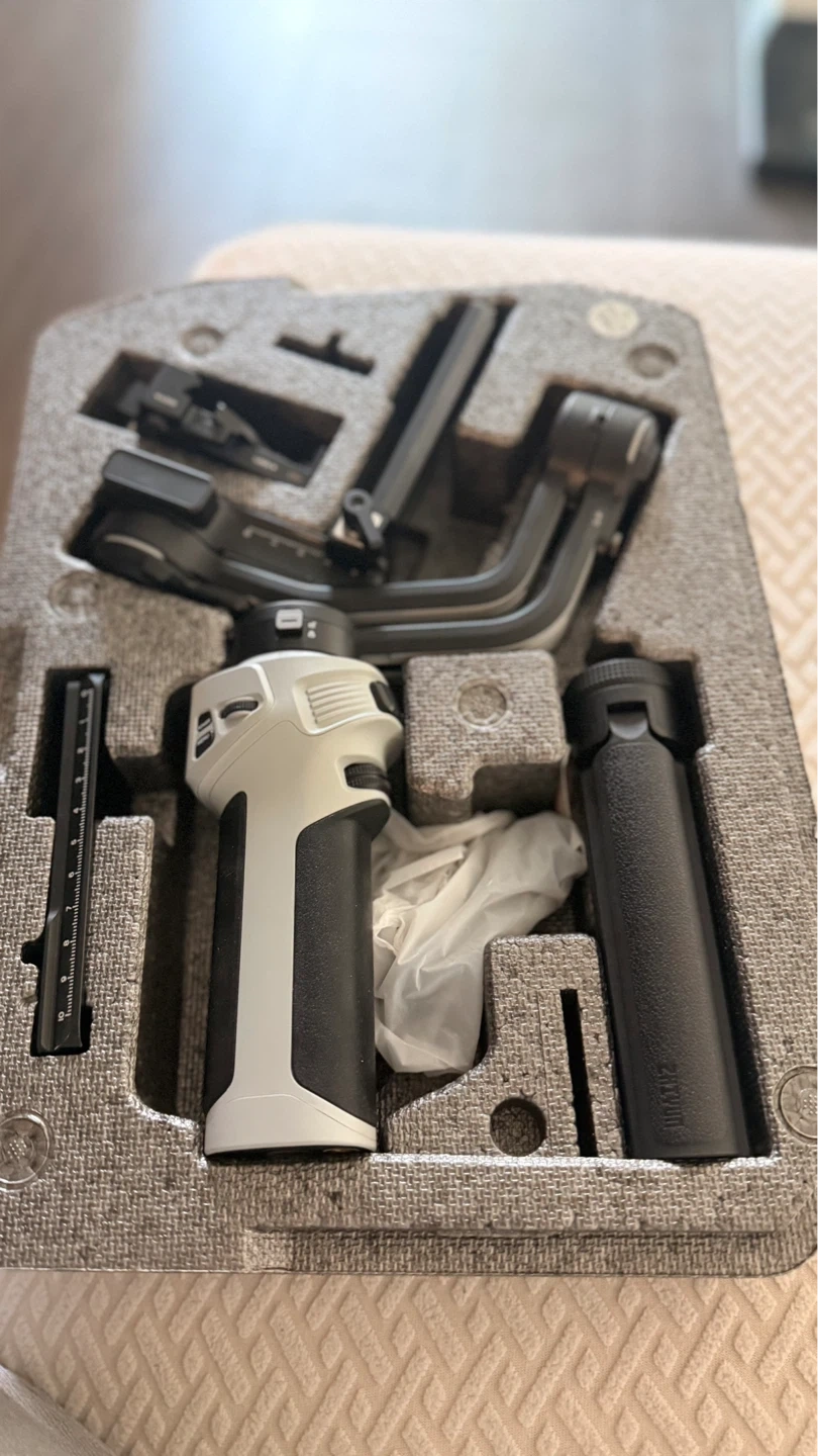 This is a Zhiyun Crane M3 gimbal for cameras. It's lightweight and compact. It includes a tripod base and other accessories.