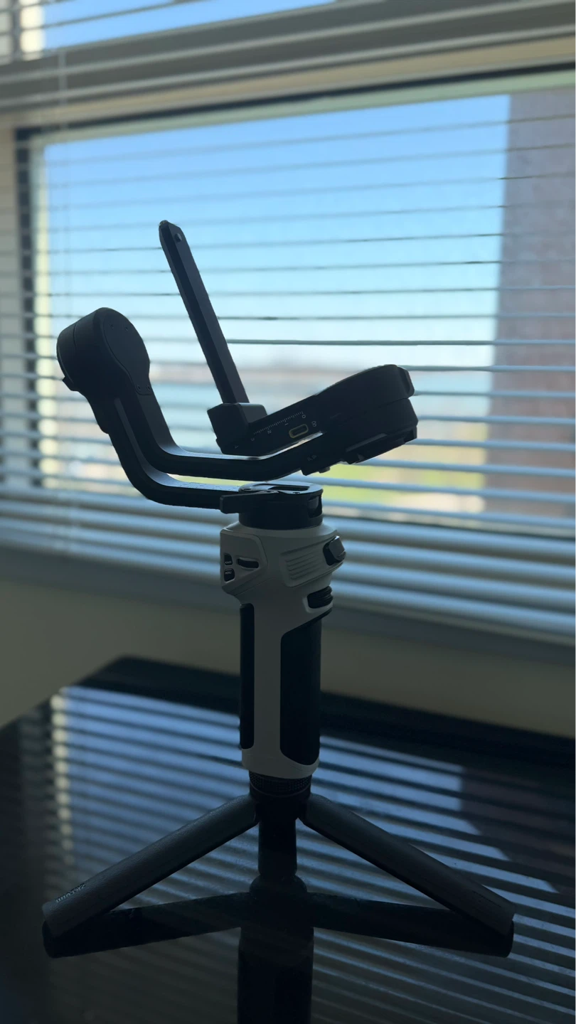 This is a Zhiyun Crane M3 gimbal for cameras. It's lightweight and compact. It includes a tripod base and other accessories.