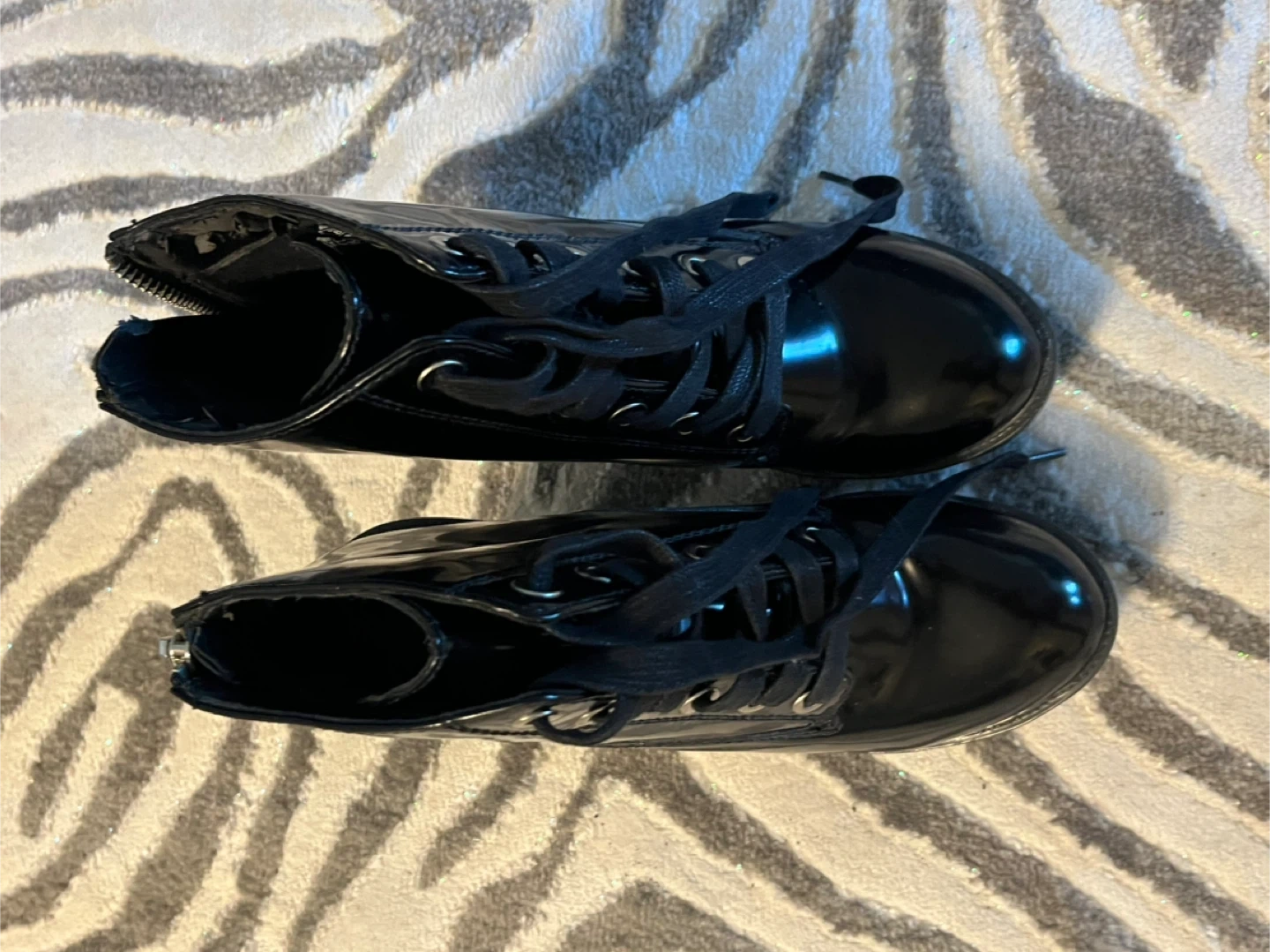Selling a pair of ALDO black patent ankle boots! They have a lace-up design. Great for adding a bit of edge to any outfit!