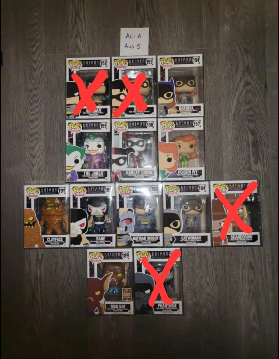 This is a collection of Funko Pop! vinyl figures from the Batman series. Figures include Batgirl, The Joker, Harley Quinn, Poison Ivy, Clayface, Bane, Batman (Robot), Catwoman, Man Bat, and Phantasm. These are collectible figures in their original boxes.