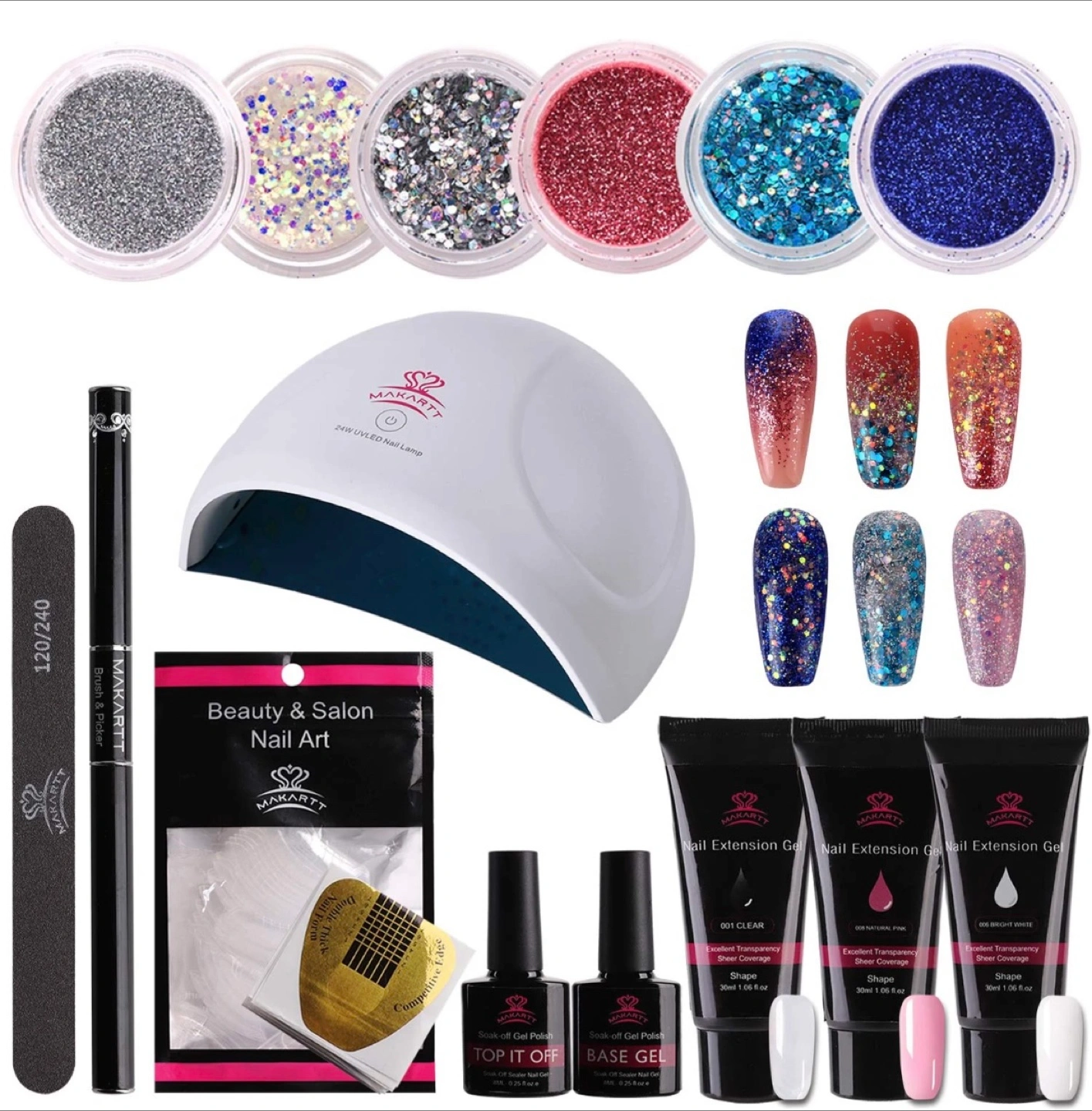 58Get salon-quality nails at home with this Makartt Nail Extension Gel Kit! This kit includes everything you need for beautiful and long-lasting nail extensions. You'll receive nail extension gels, top and base coats, glitter powders, a nail lamp, and other essential tools to achieve the perfect manicure.