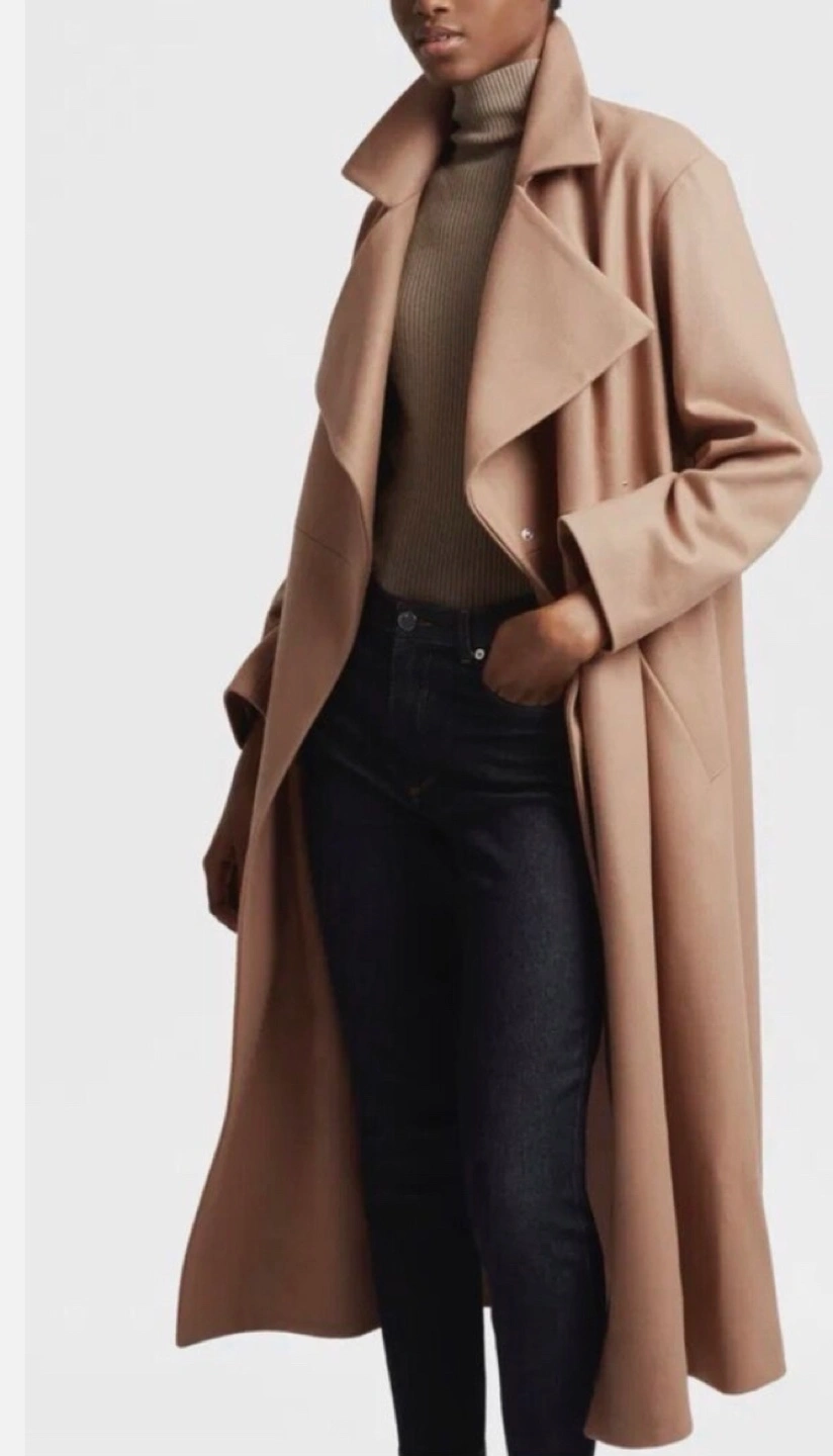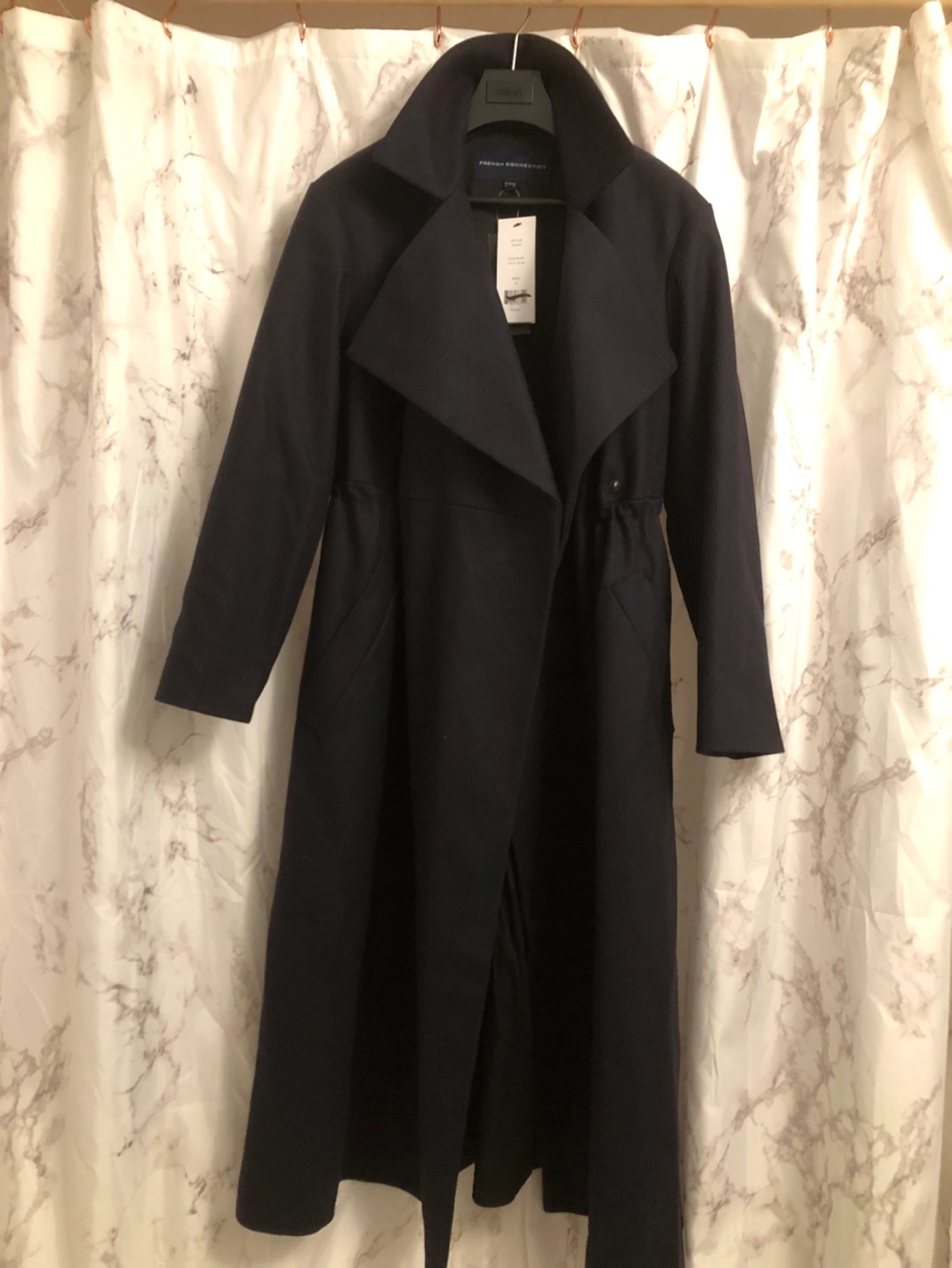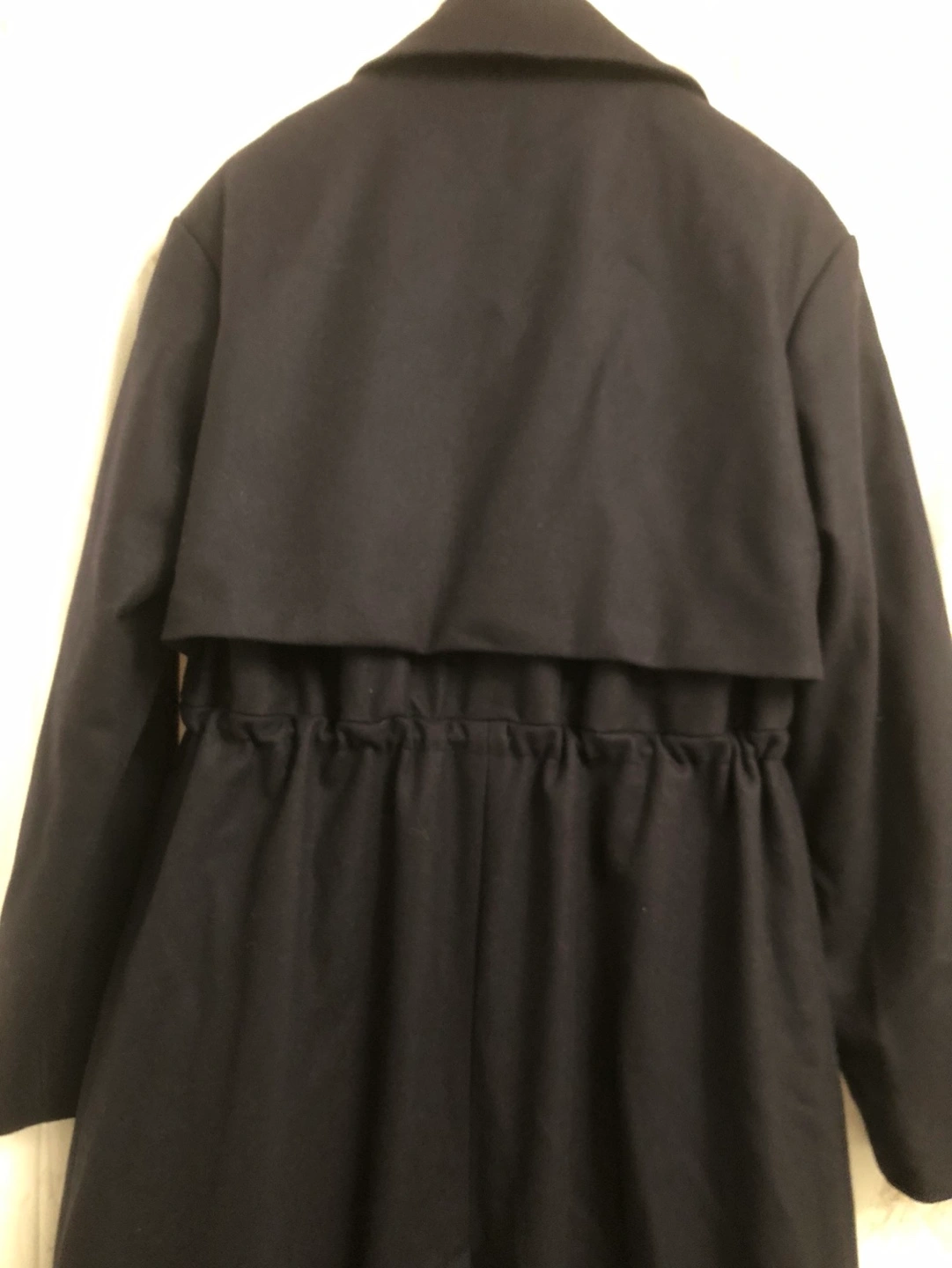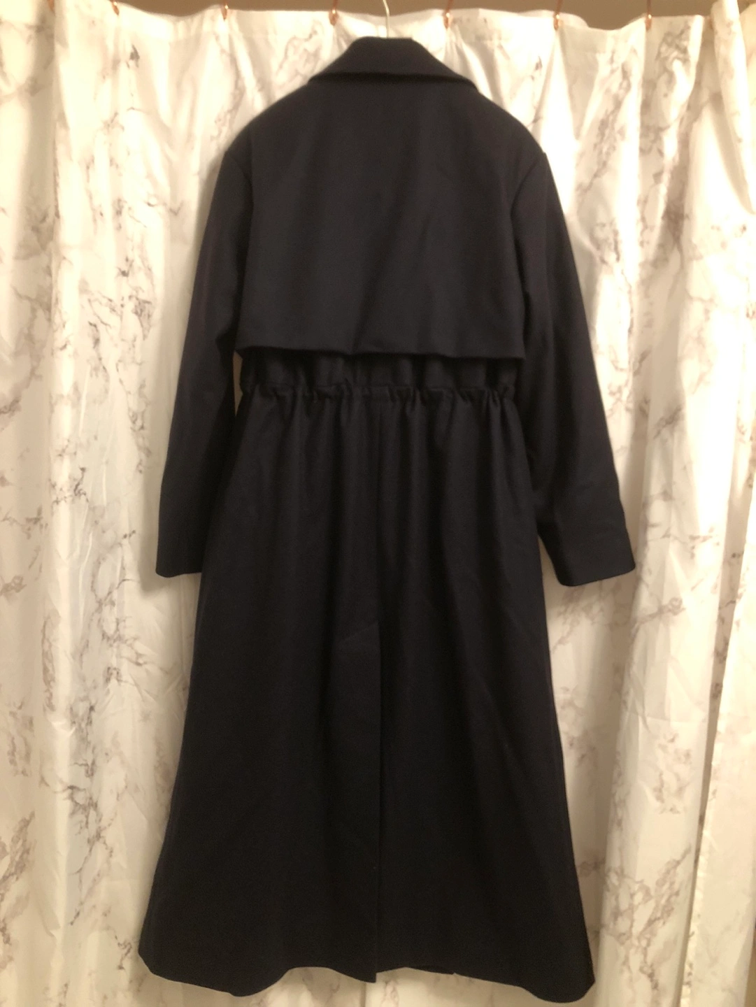 Lovely Long Wooland Cashmere blend Navy Blue coat with a cinched waist and a collar that can be worn up or down.