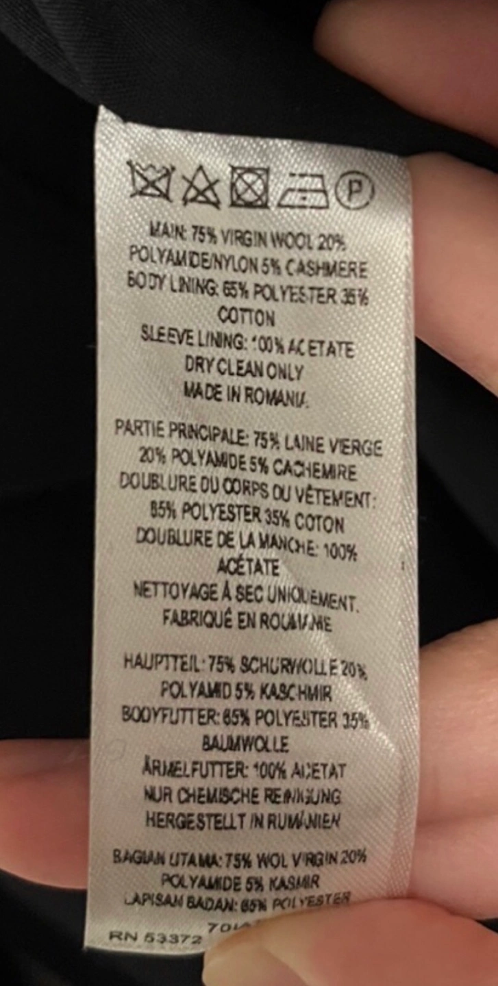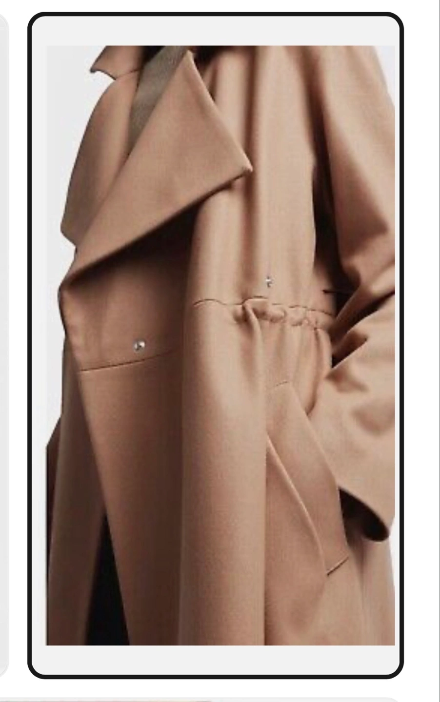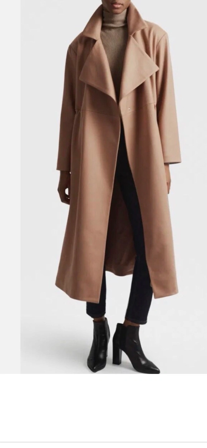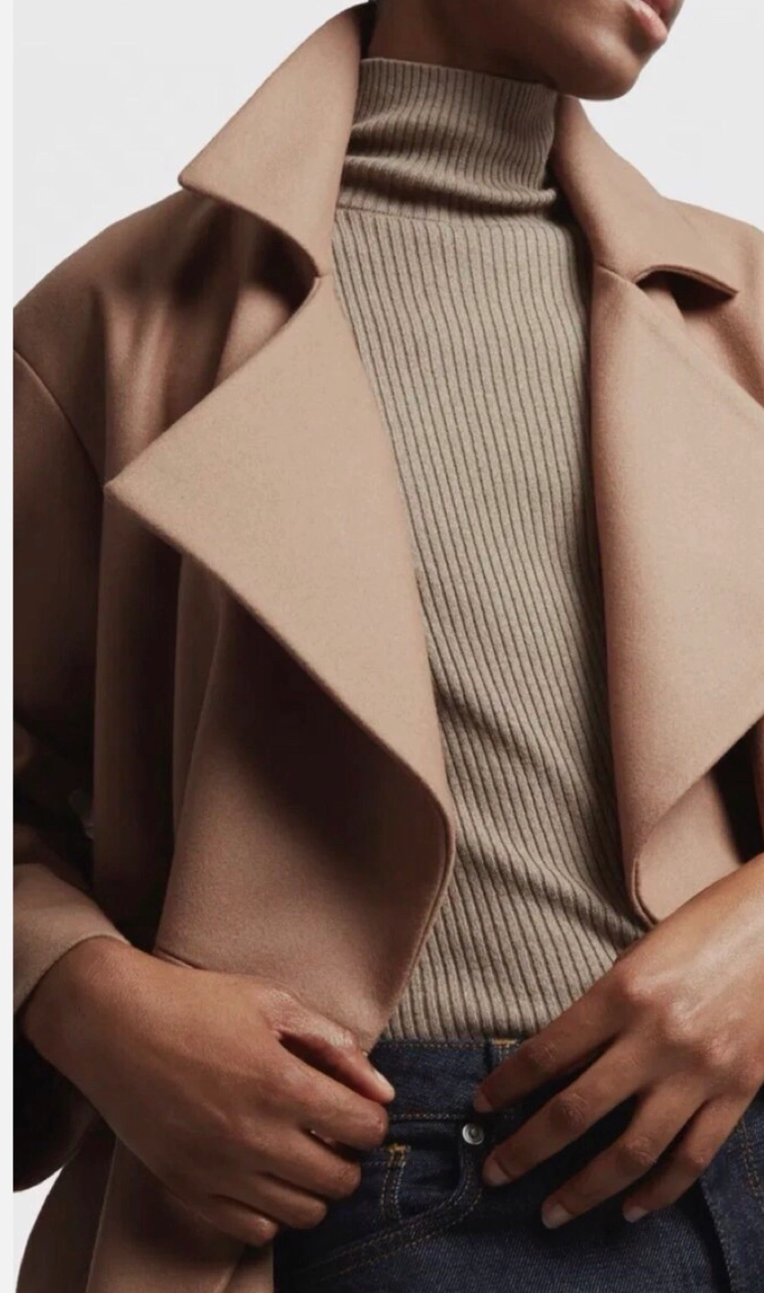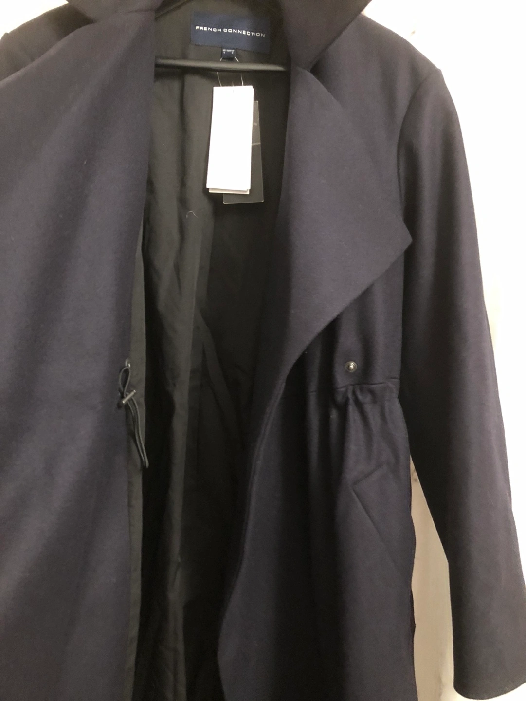Lovely Long Wooland Cashmere blend Navy Blue coat with a cinched waist and a collar that can be worn up or down.
