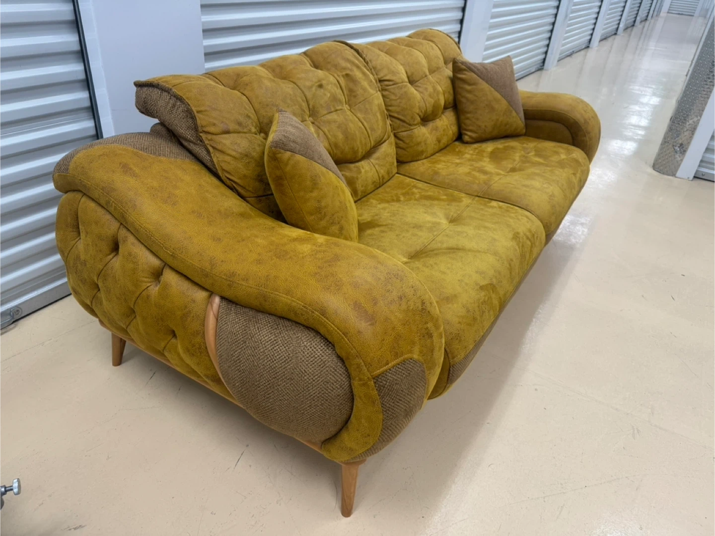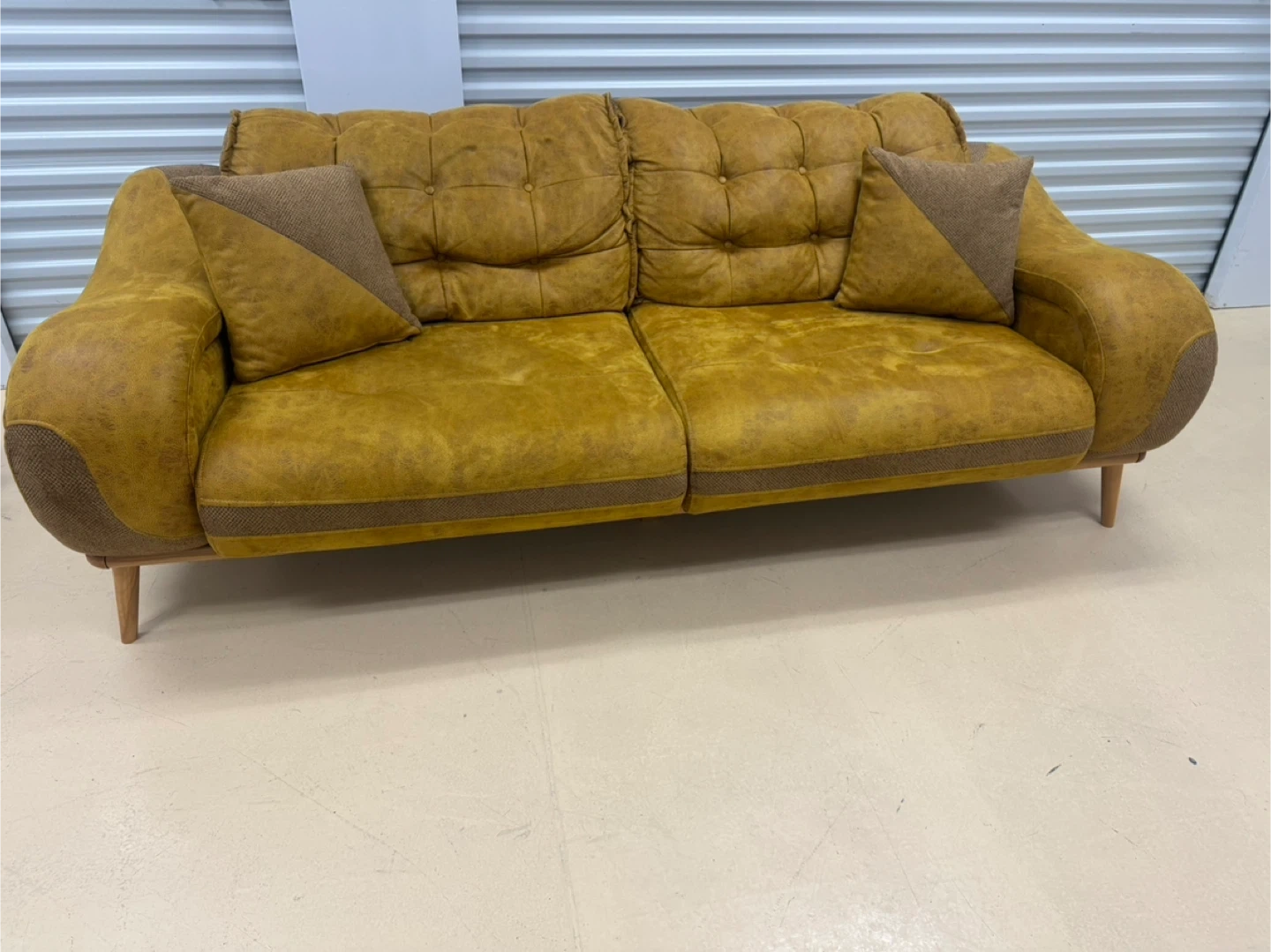 A stylish yellow sofa featuring deep tufting on the back cushions and seat. It comes with two accent pillows. The sofa has rounded arms and wood legs. Upholstered in a textured fabric, it adds a pop of colour to any living space!home delivery available