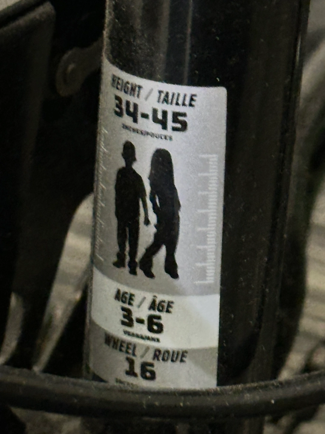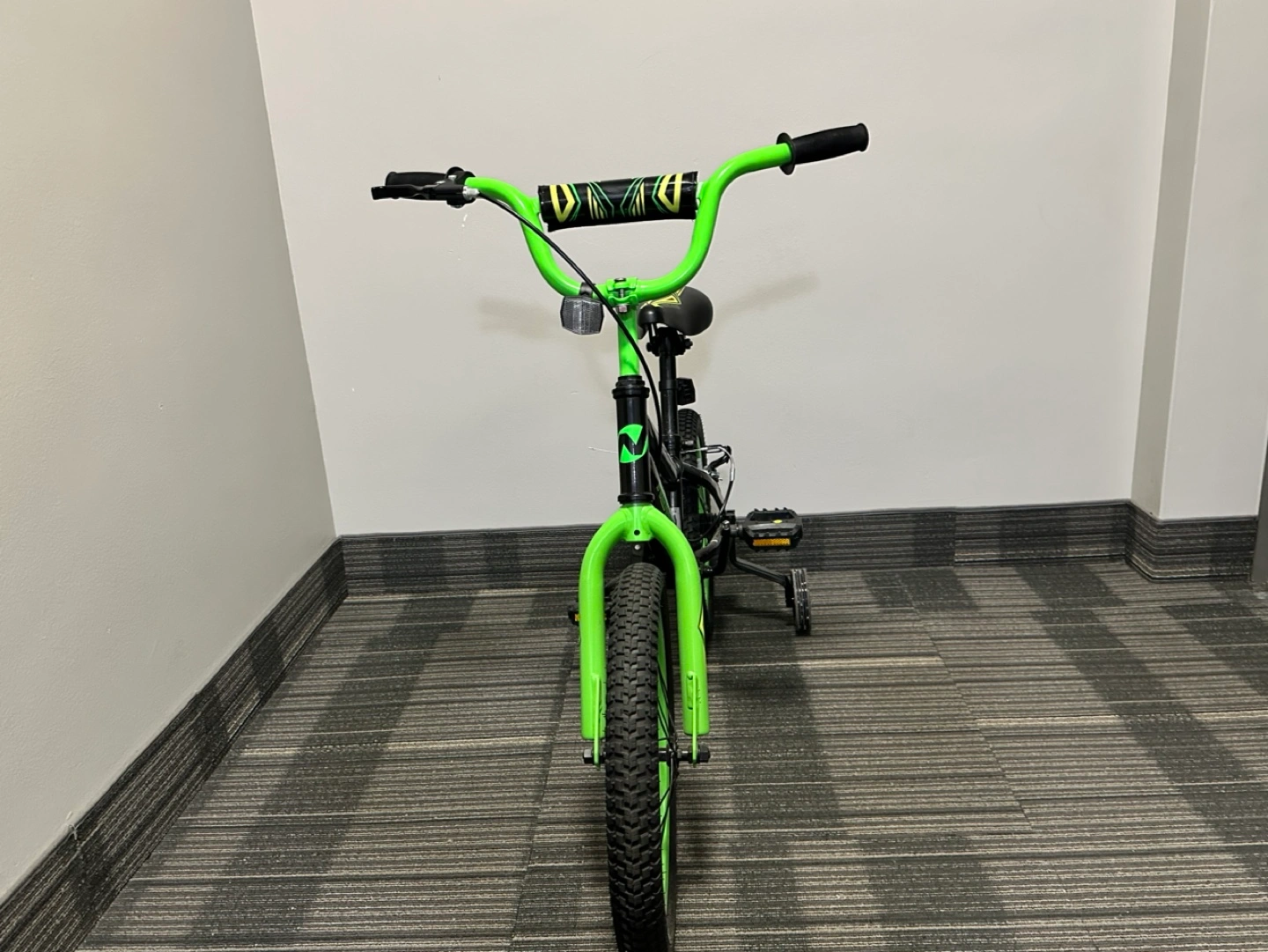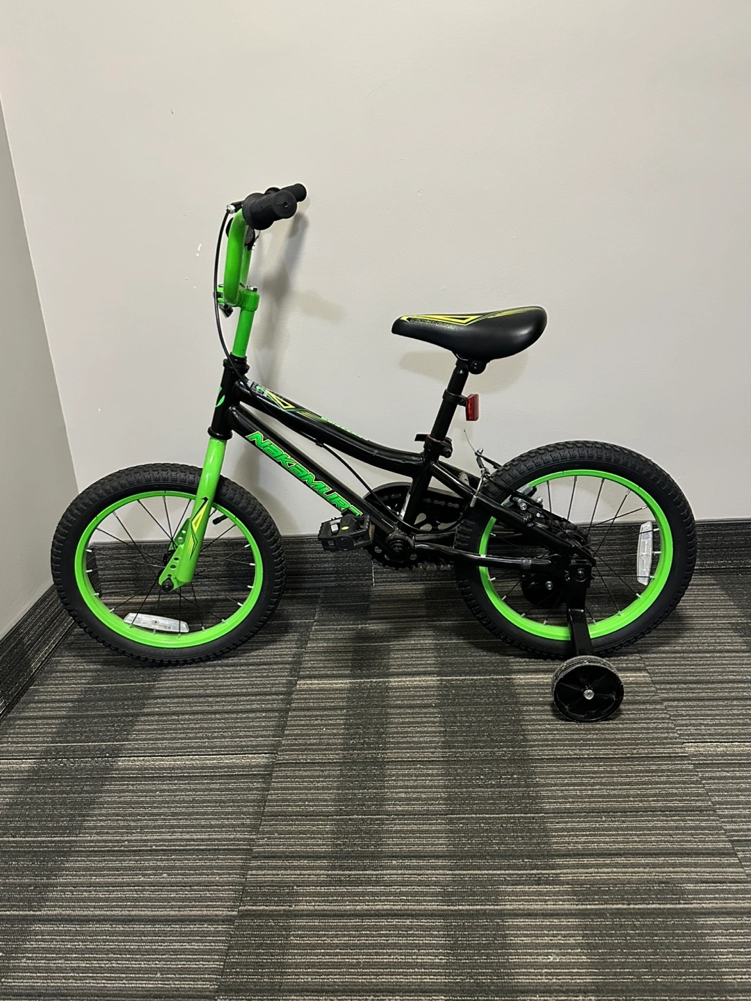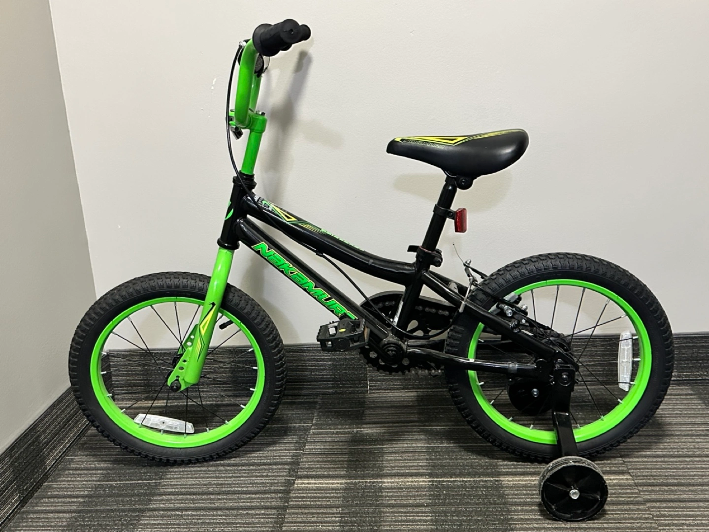 Nakamura 16 inch wheel children's bicycle. Black frame, lime green accents. Includes training wheels. Suitable for children aged 3-6, 34-45 inches tall.