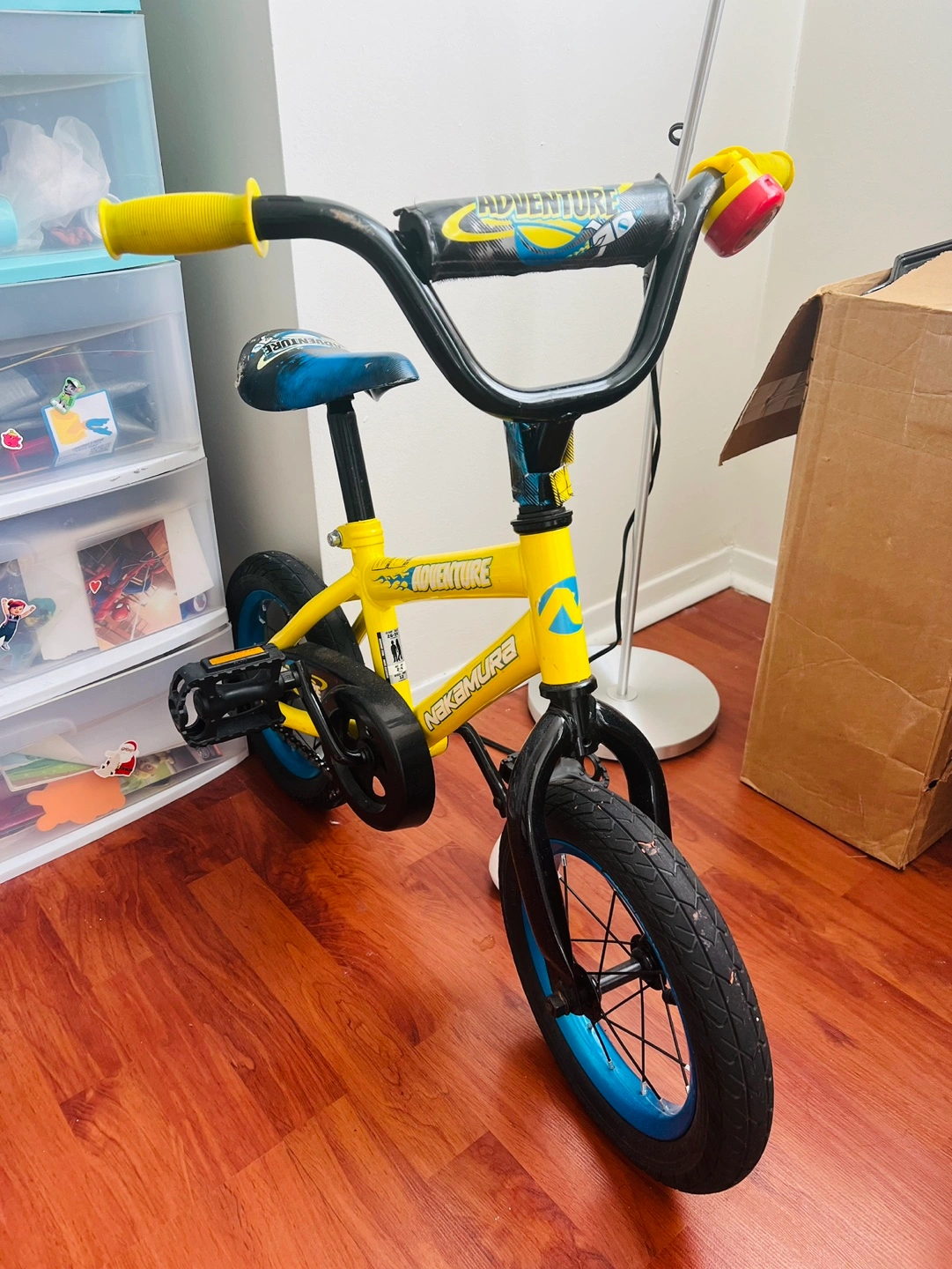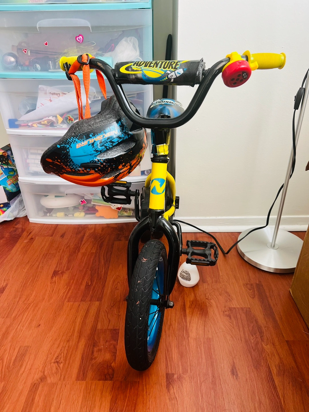 Yellow kids bike with black frame and blue wheels. Includes helmet.
