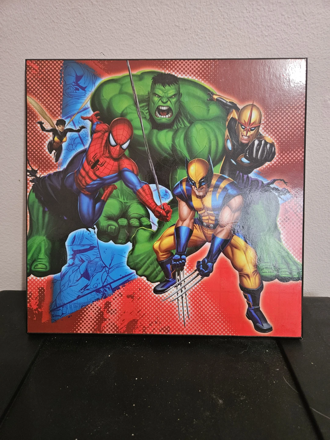This poster features a dynamic illustration of several Marvel superheroes including Hulk, Spider-Man, Wolverine, Wasp and Nova. It's a vibrant addition for any fan's collection. Great for decorating a room or for a themed event!