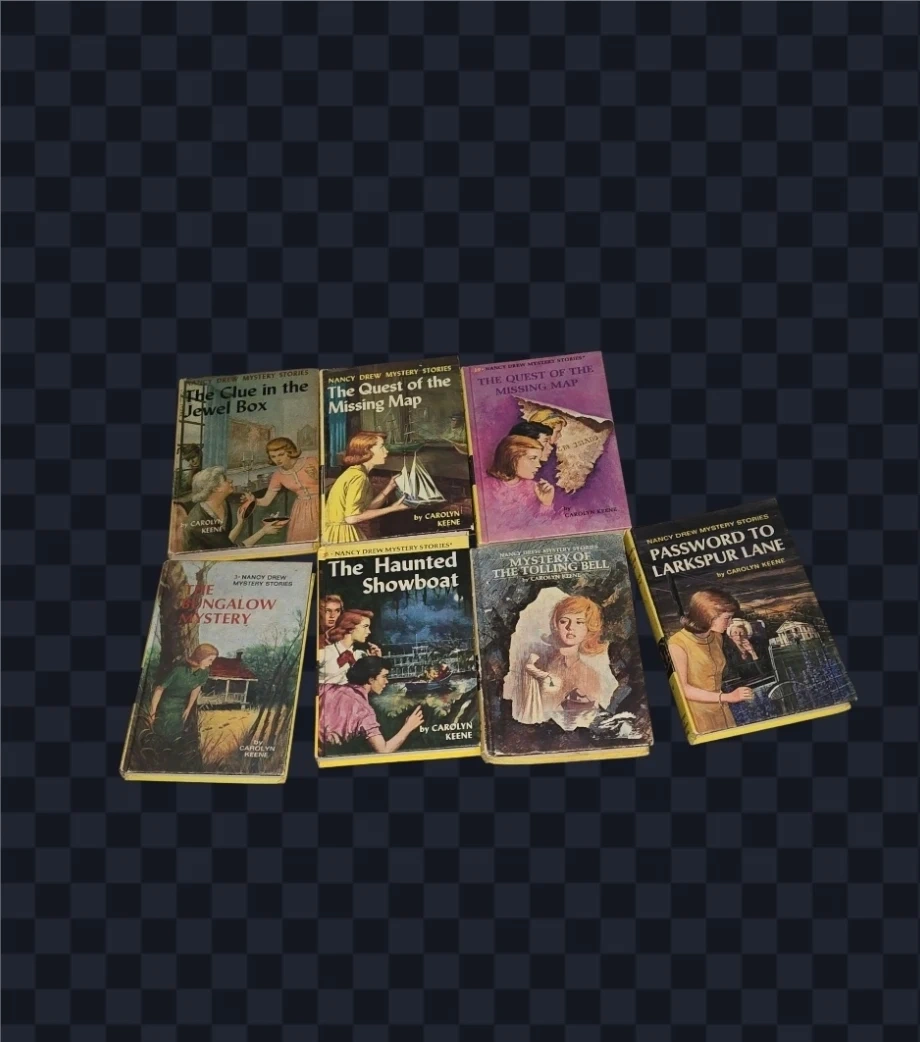 65Selling a collection of Nancy Drew Mystery Stories by Carolyn Keene! Titles include: - The Clue in the Jewel Box - The Quest of the Missing Map - The Bungalow Mystery - The Haunted Showboat - Mystery of the Tolling Bell - Password to Larkspur Lane