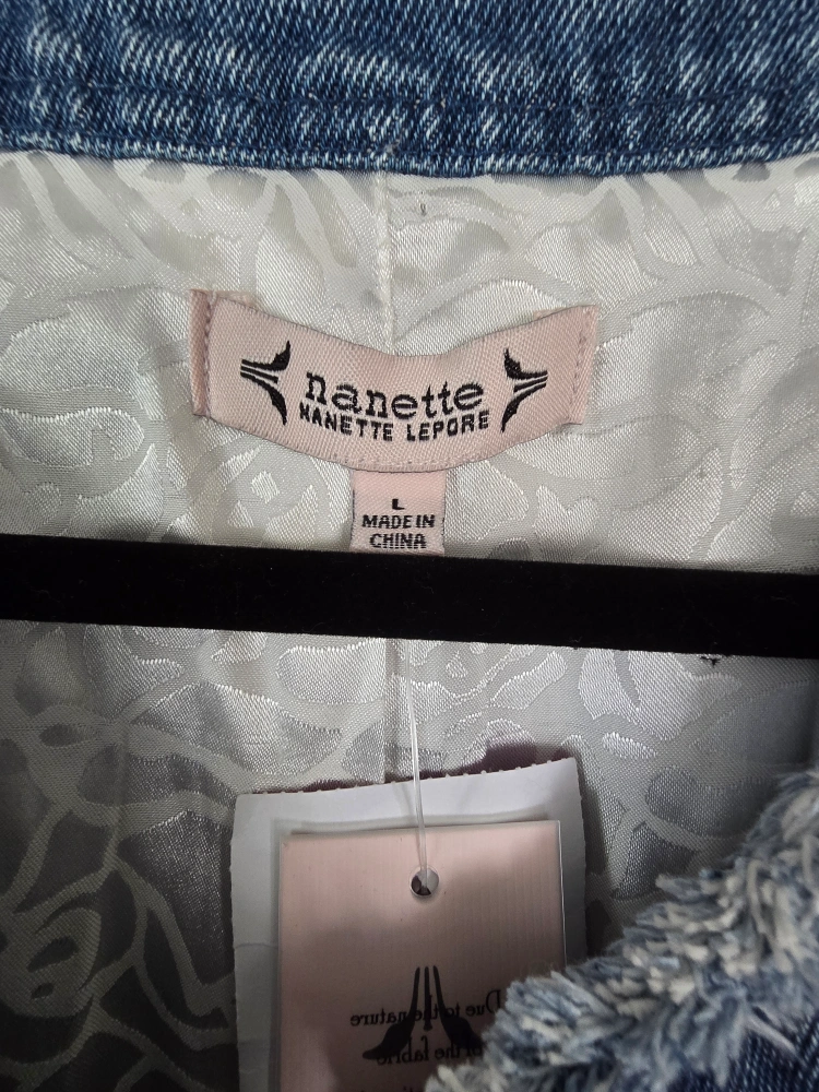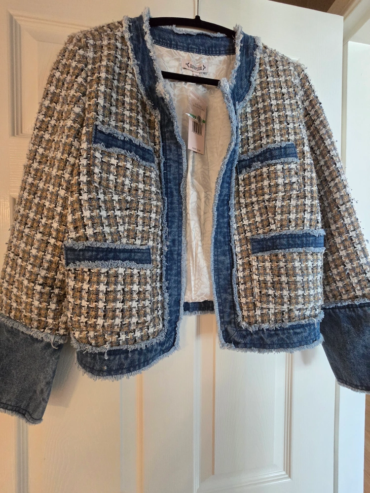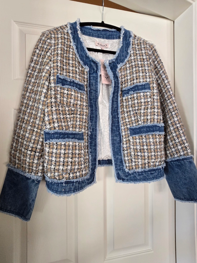 Women's size large (would fit an XL too) Nanette Lepore short jacket. Tweed fabric with denim accents. Three-quarter sleeves. Open front. BNWT