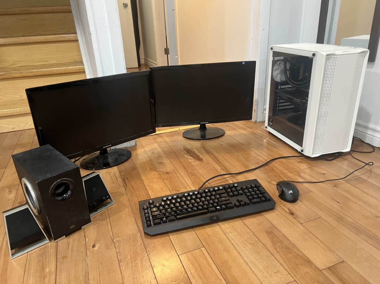 Pristine condition gaming pc. Comes with two 24 inch monitors (Samsung). Corsair Scimitar Pro mouse , Razer Blackwidow Chroma keyboard and a set of speakers with subwoofers.