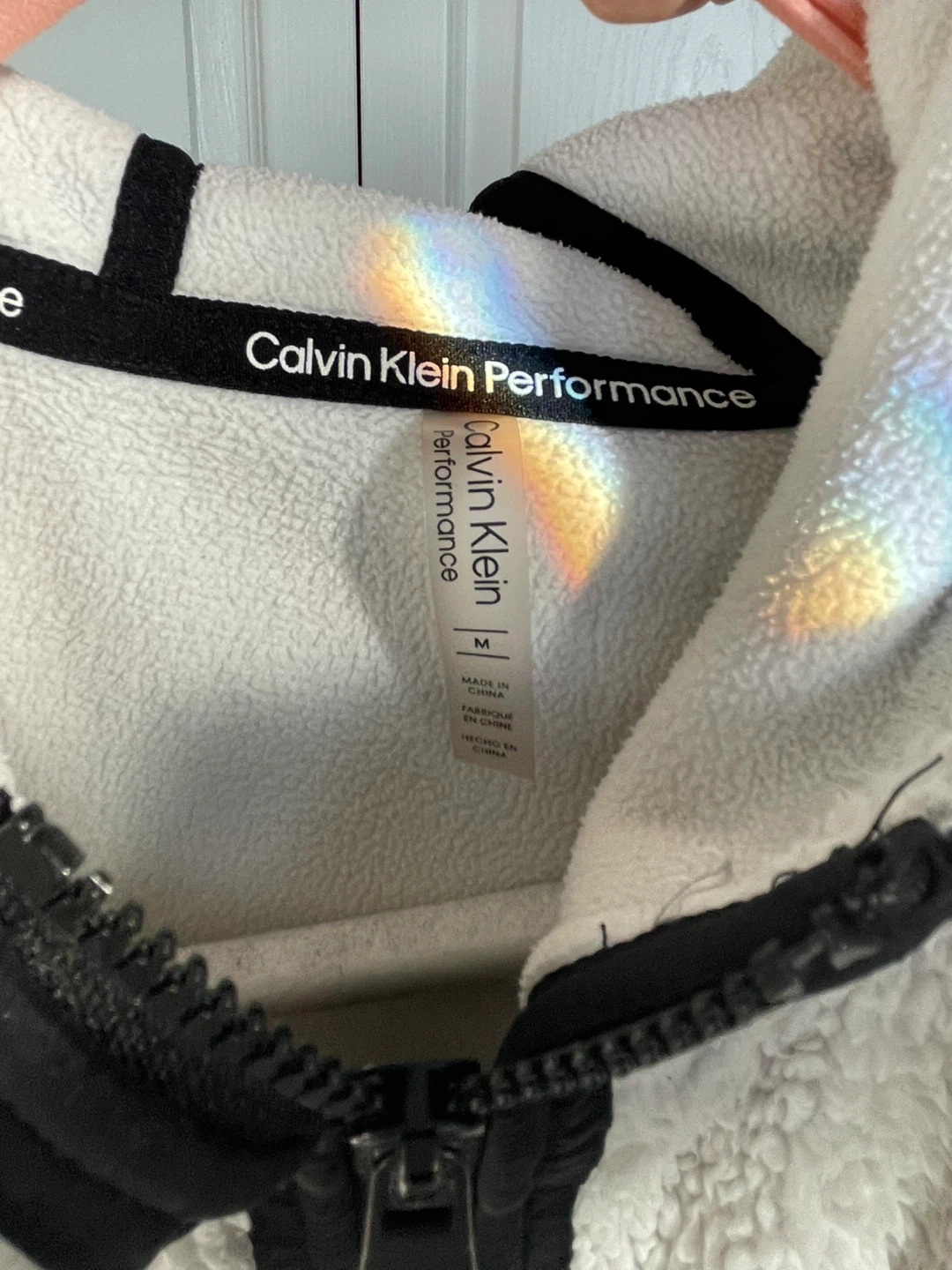 Cozy white teddy fleece full-zip hoodie by Calvin Klein Performance. It's a size medium with black contrast panels on the sleeves and sides. Perfect for layering on cooler days!