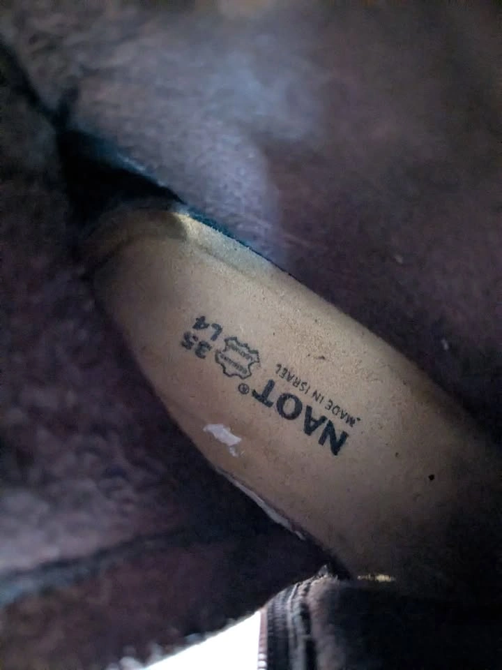 20EUC gorgeous NAOT tall boots, size 35. Shiny brown leather, with matte leather detail down the side. Zipper on the other side. Elasticized section down the back to the ankle for extra stretch around the calf. Very comfortable footbeds. Thinly lined on the inside. 2.25" heel, 13" shaft (measured from heel), 14.25" circumference at top of shaft. Minor scuffs on the toes (see pics). Everything else is in excellent condition. Location: near Promenade Mall in Thornhill.