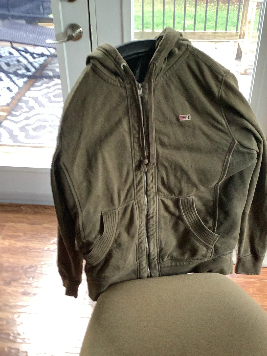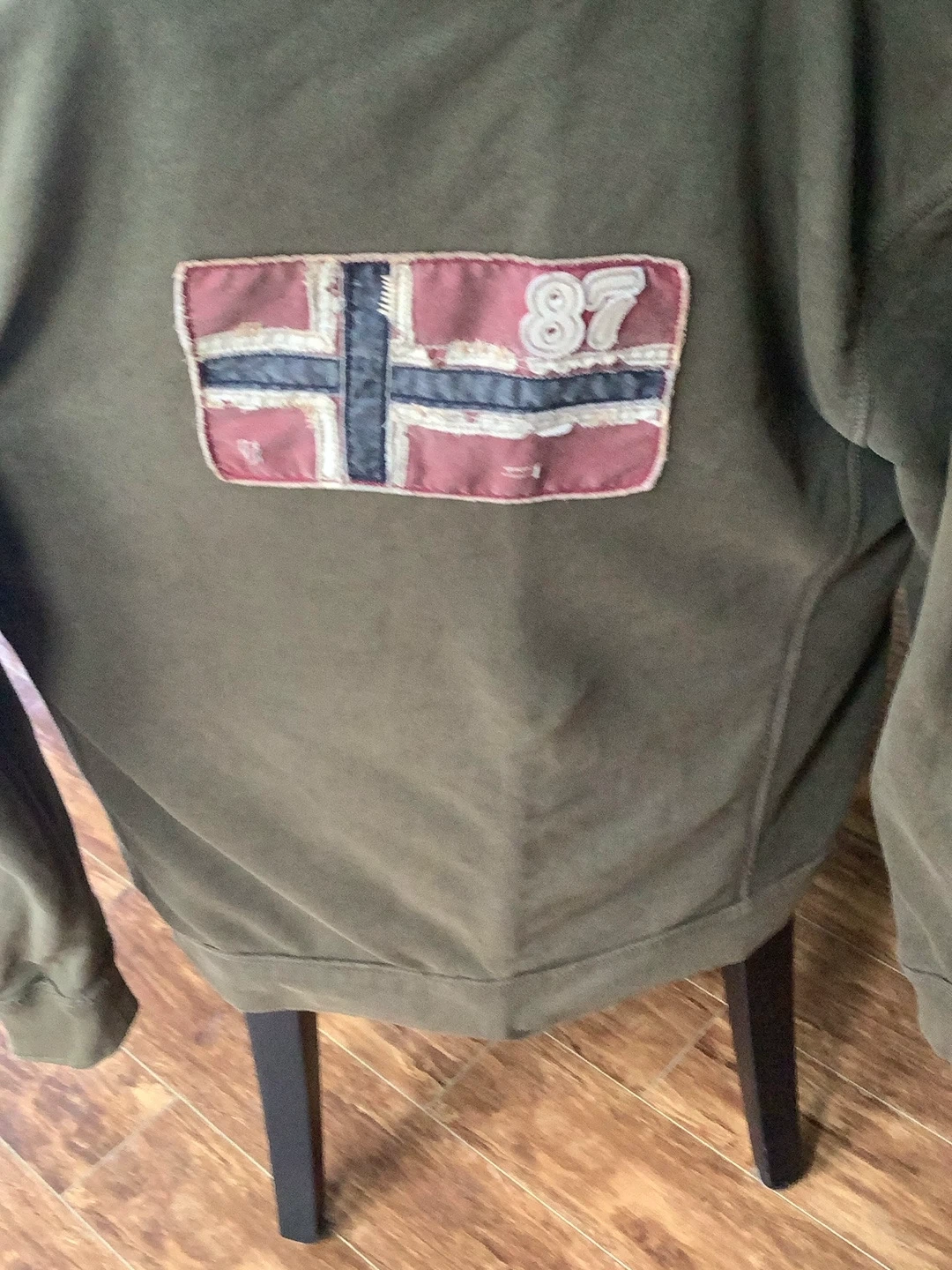 Cozy up in this Napapijri full zip hoodie! It's in a lovely olive green colour and features a unique design on the back. Perfect for layering on those cooler Canadian days