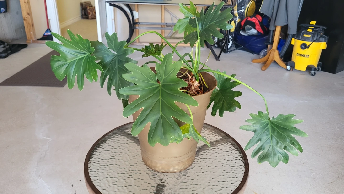 A healthy Philodendron Selloum plant in a golden pot. It has large, deeply lobed green leaves. Easy to care for and adds a tropical feel to any space!