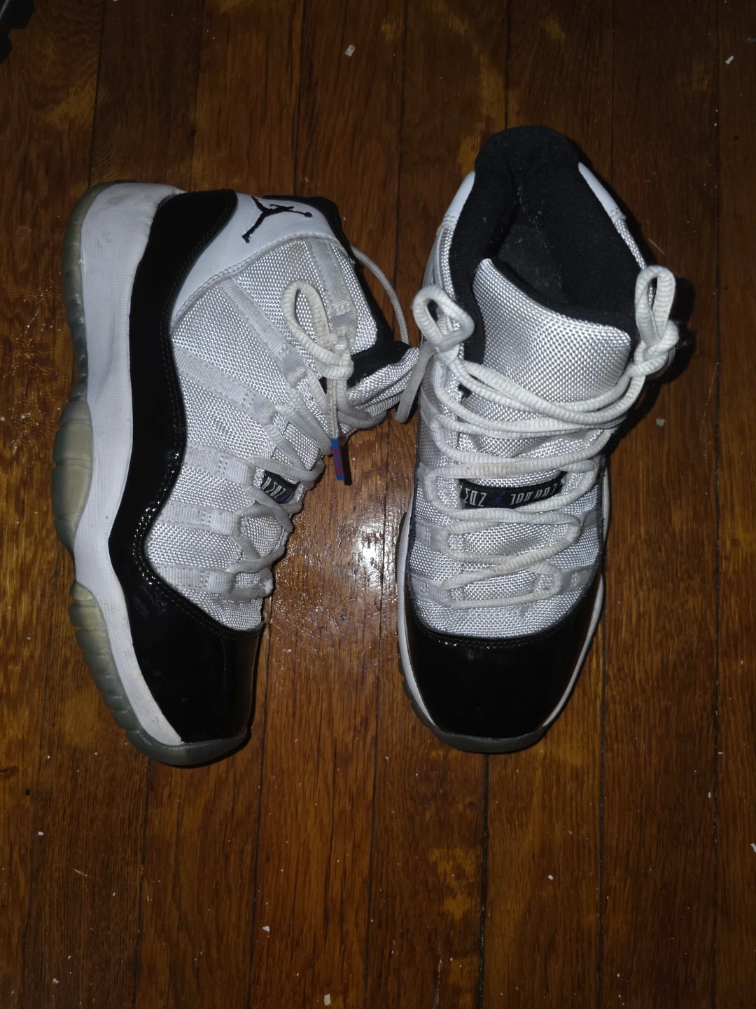 Air Jordan 11 Retro sneakers in the "Concord" colorway. Features a white mesh and black patent leather upper with a translucent outsole. These are a size 7Y.
