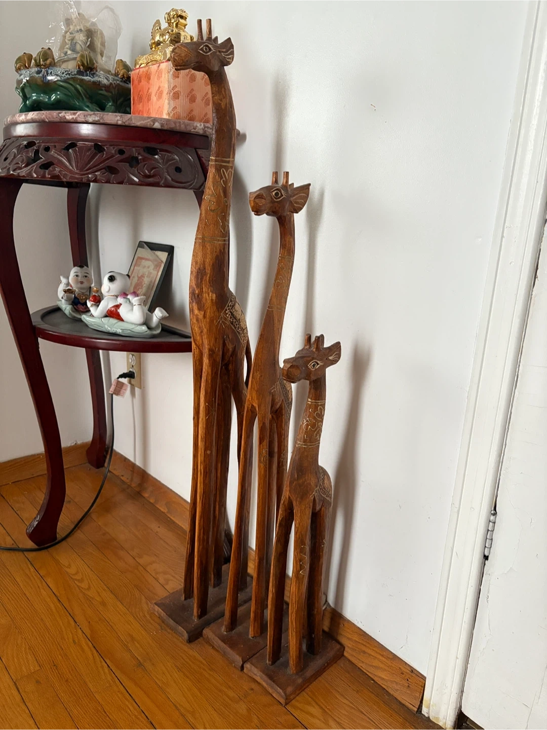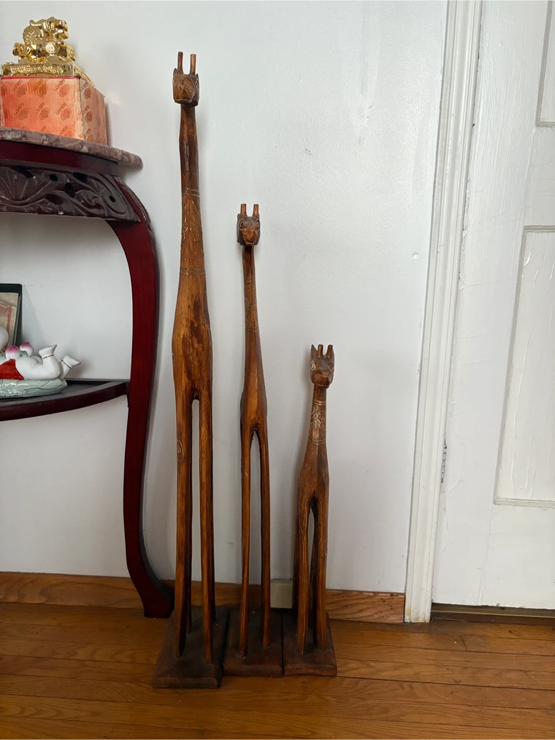 This is a set of three decorative wooden giraffe figurines. They are carved from wood and have a natural finish. The giraffes stand on a flat base for stability. These would make a charming addition to any room! 40inches,32inches,24inches