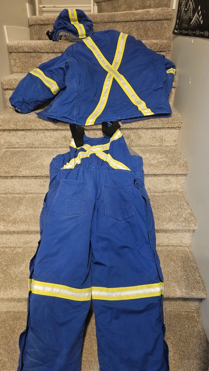 This is a blue Stalworth winter bib overall and jacket set. It features reflective safety stripes. Both pieces are lined and insulated for warmth. Includes a removable hood. The jacket is a size L and the bib overalls are a size XL. I'm 5'10 and 180 lbs just to give you an idea of how they fit.