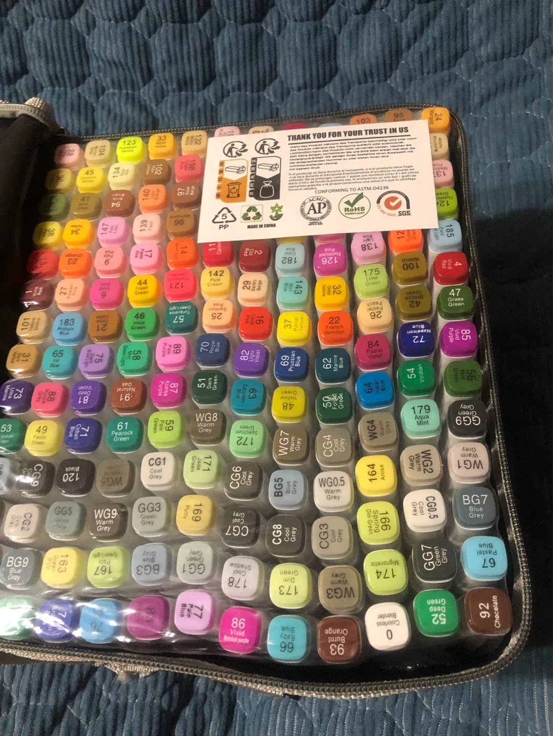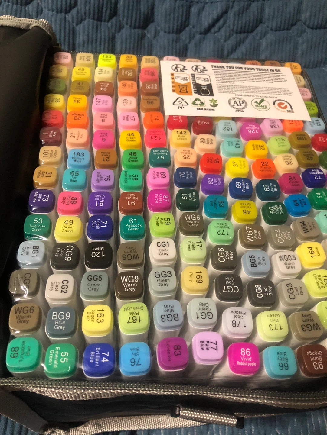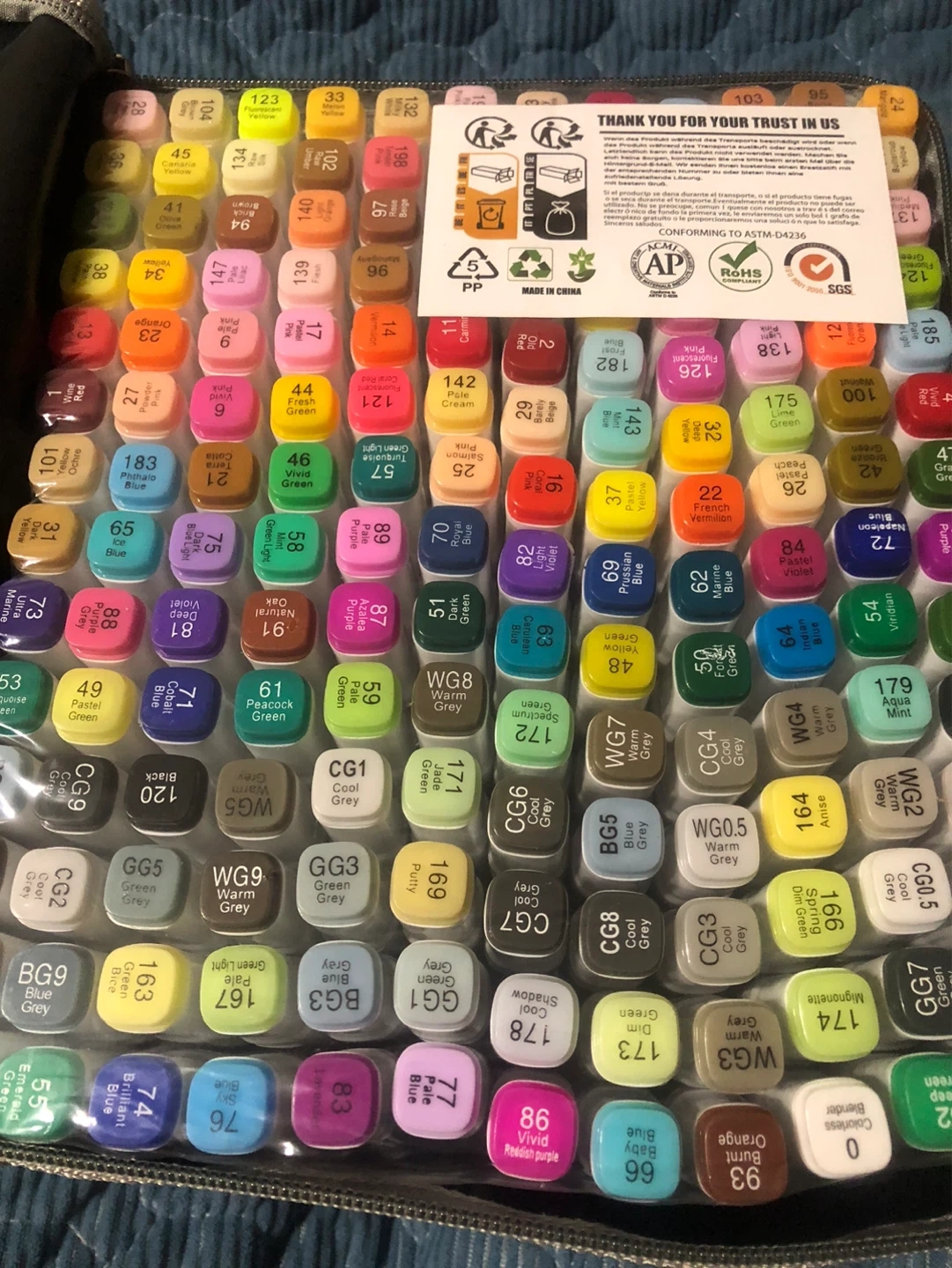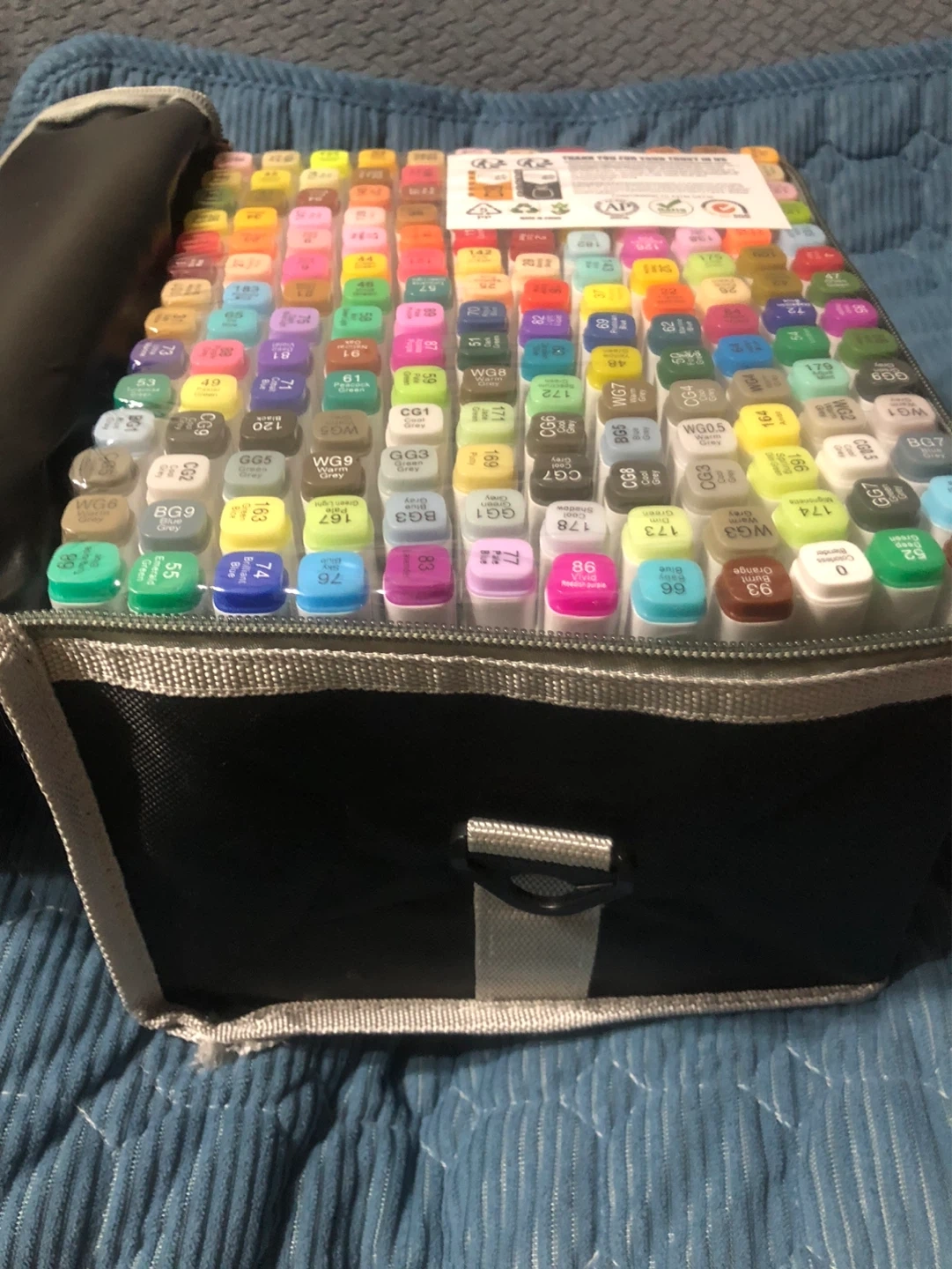 This new set includes 168 alcohol-based art markers in a wide variety of colours. Each marker is labelled with its colour name and code, and they come in a convenient black carrying case. The markers are conforming to ASTM D4236 standards.still packed in the original package box!