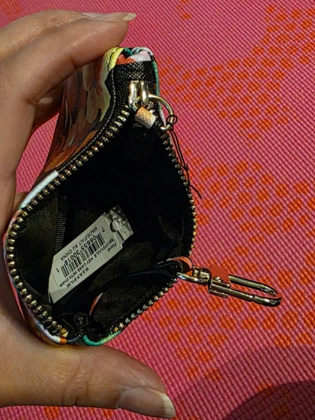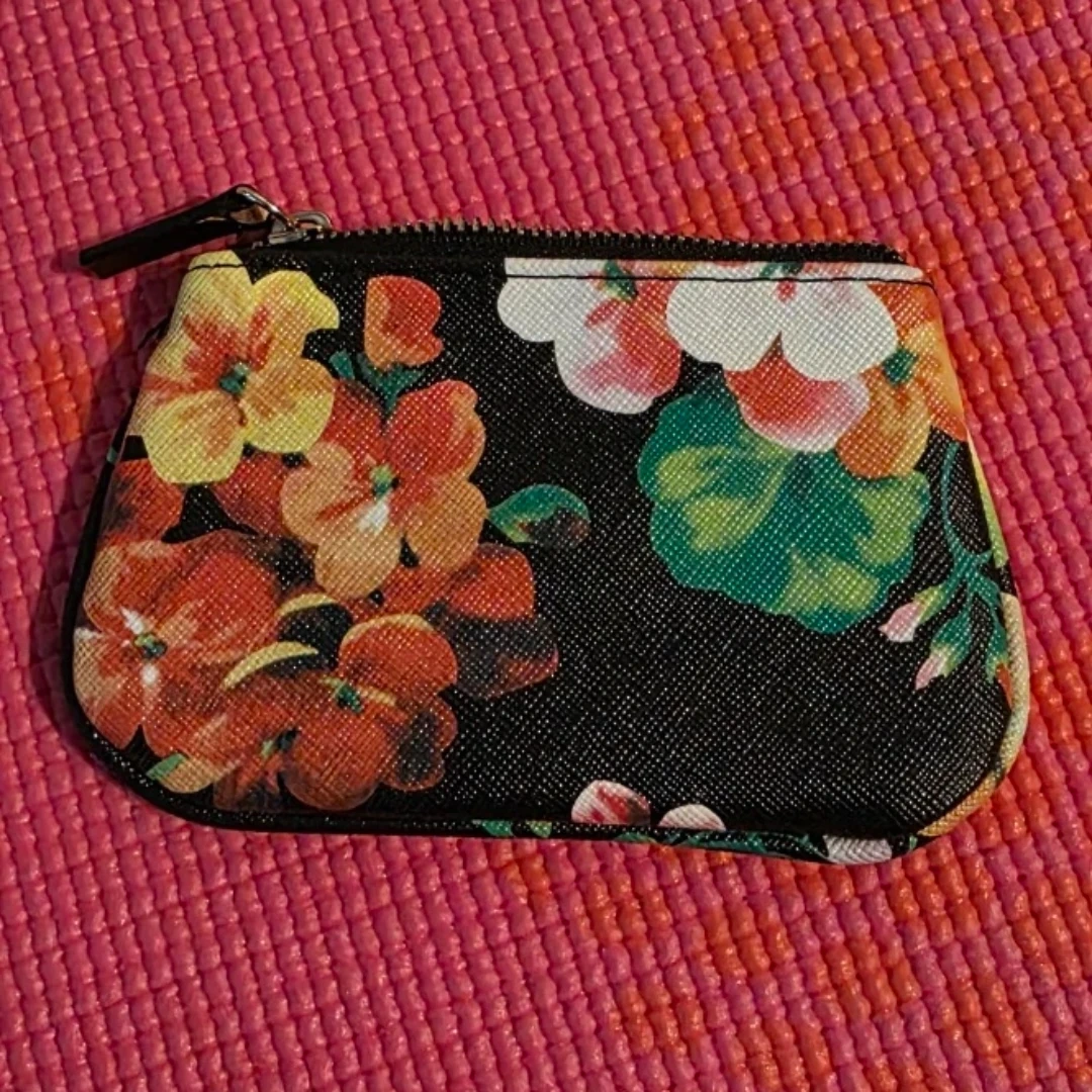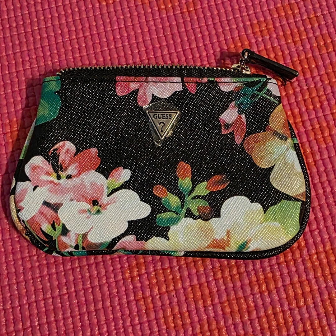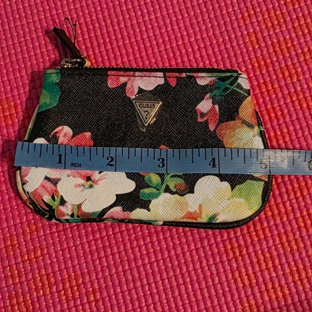 Brand new with tag, Guess coin purse with a floral print and a detachable key ring. It's made with a saffiano-style material. This could be used for loose change, cards, or small essentials. Measurements in pictures.